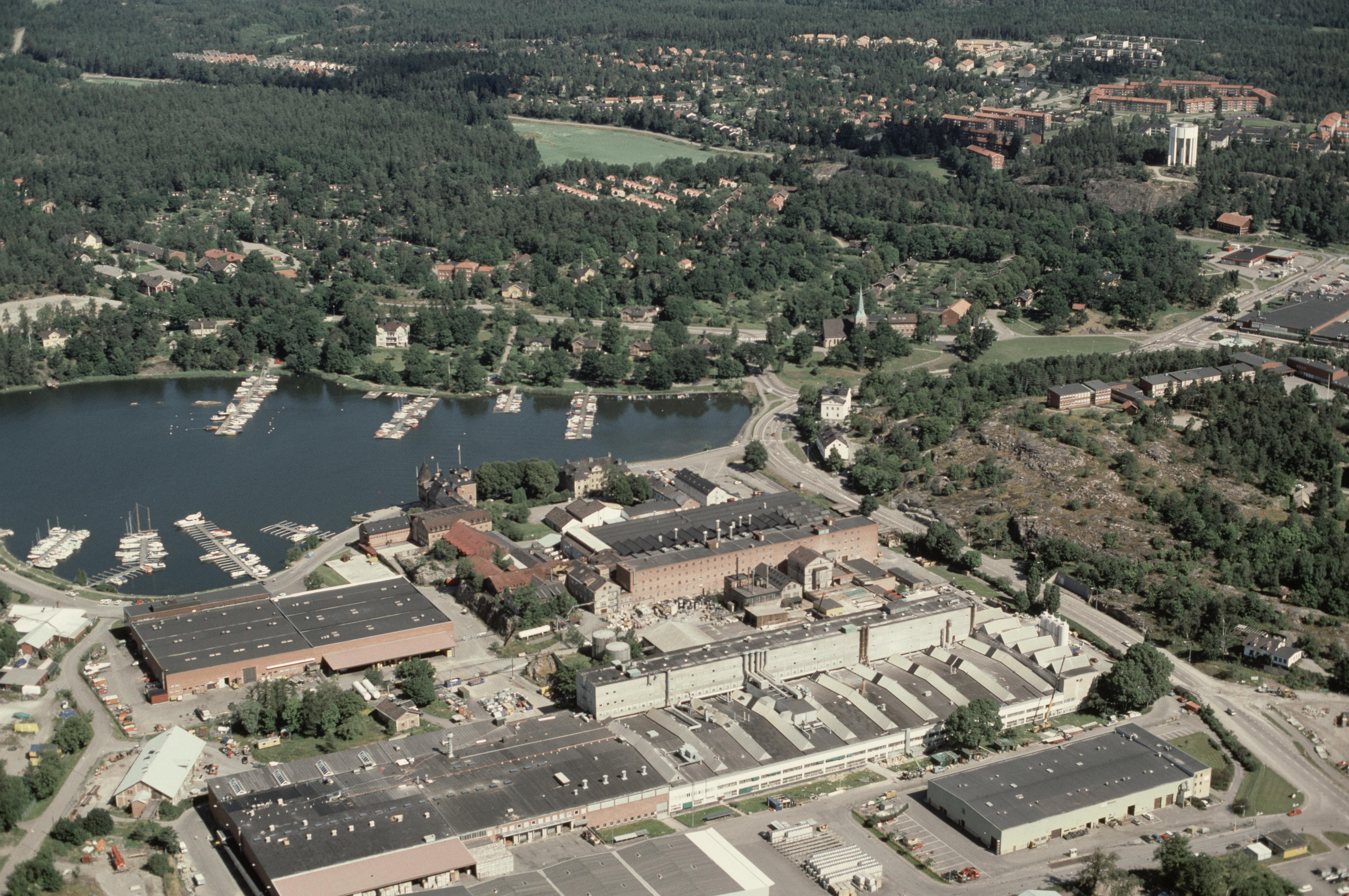 Gustavsbergs tätort vid Farstaviken. Porslinsfabrikerna i bildens nedre del. Vid bildens mitt Gustavsbergs kyrka. I bildens övre del arbetarbostäder för porslinsfabriken, Höjdhagen, Grindstugärdet, Grindstugatan RAÄnr Gustavsberg 36:1 och Värmdögatan. Bilden är tagen mot (väderstreck): N