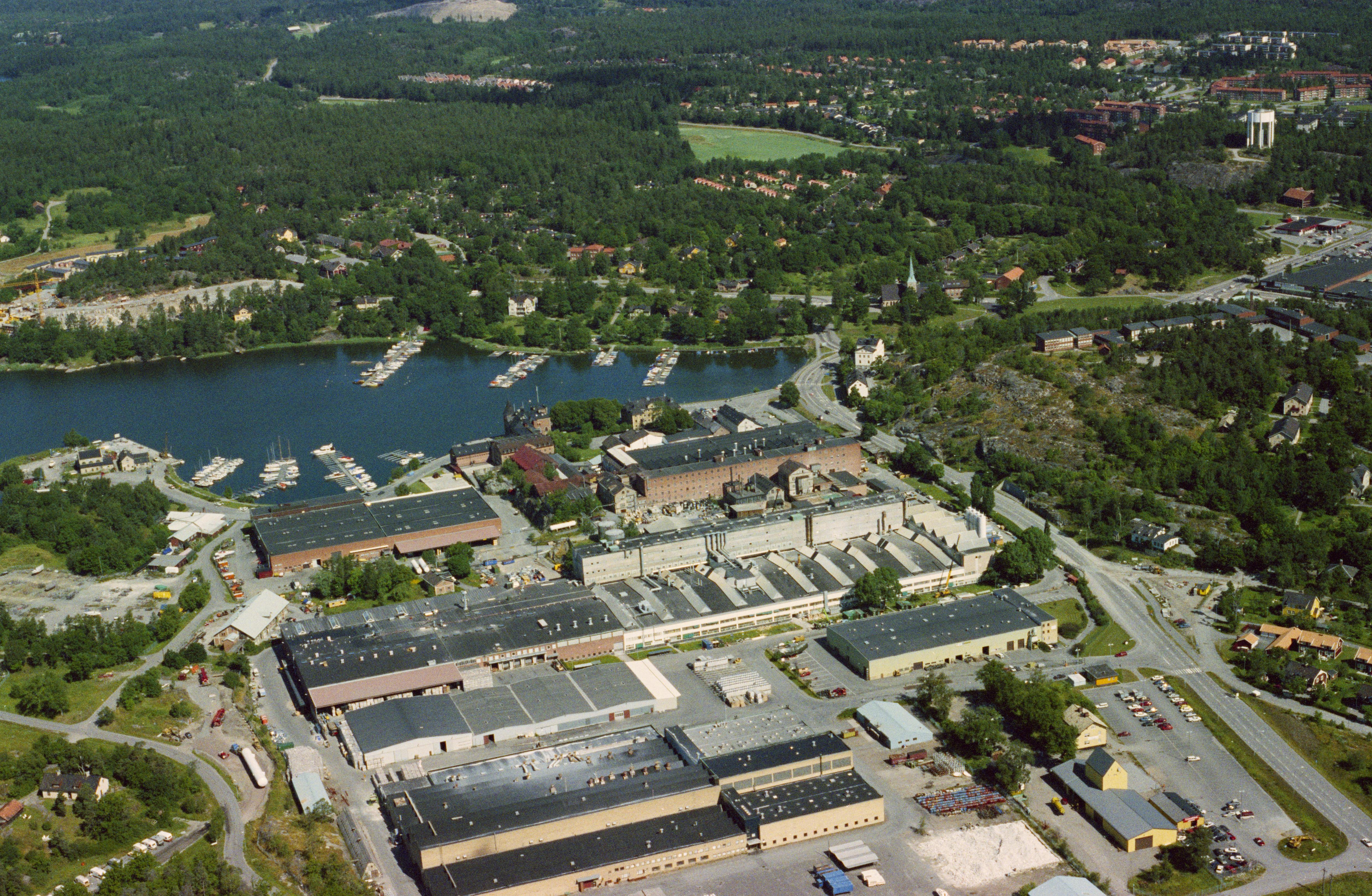 Gustavsbergs tätort vid Farstaviken. Porslinsfabrikerna i bildens nedre del. Vid bildens mitt Gustavsbergs kyrka. I bildens övre del arbetarbostäder för porslinsfabriken, Höjdhagen, Grindstugärdet, Grindstugatan RAÄnr Gustavsberg 36:1 och Värmdögatan. Bilden är tagen mot (väderstreck): N