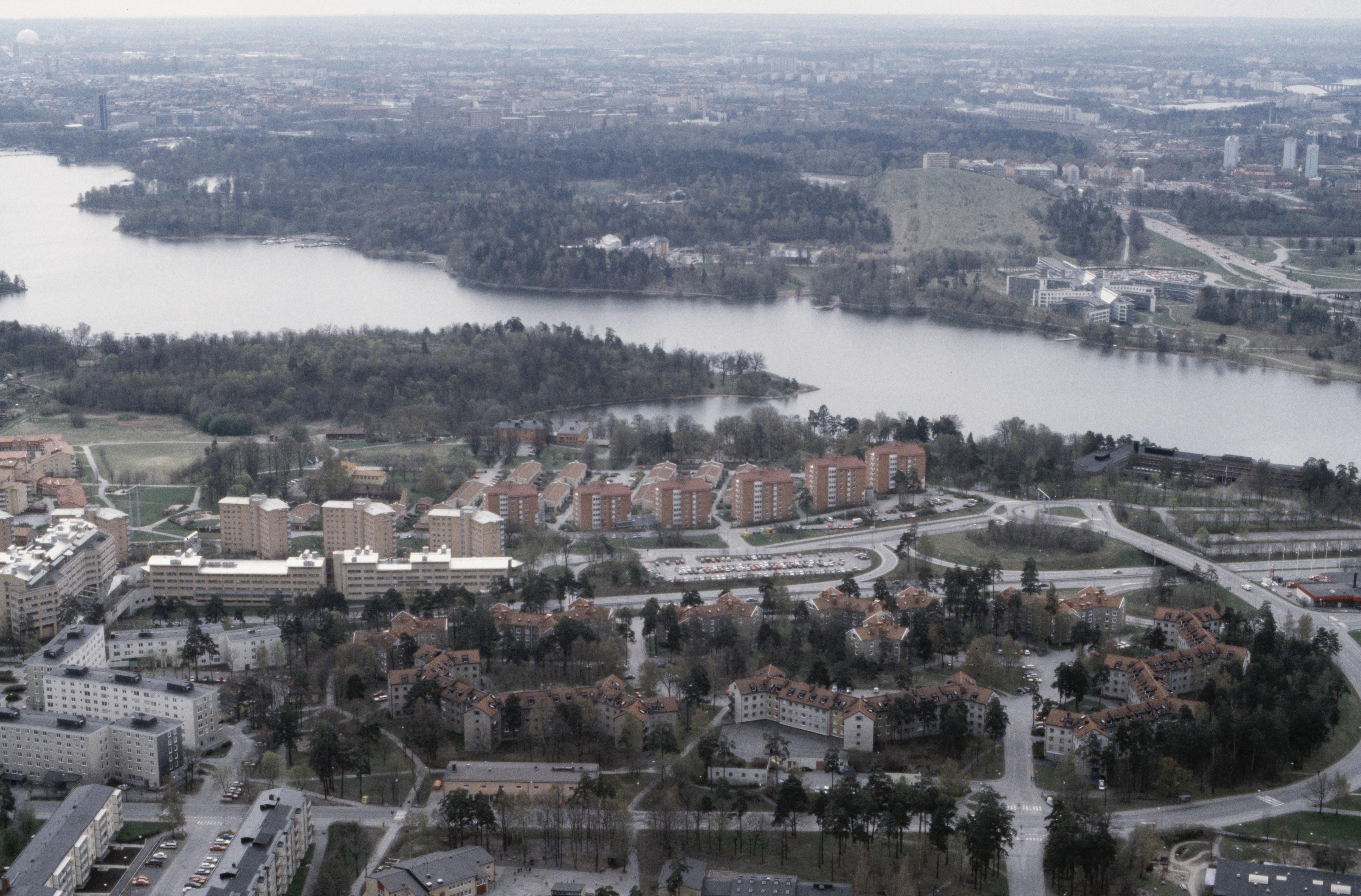 Stadsdelen Bergshamra i Solna vid Brunnsviken. Vid bildens mitt Tivoliudden och byggnaderna Statens Växtskyddsanstalt, på Pipersvägen. I bildens övre del Haga slott, Frösundavik och Stockholms stad. Bilden är tagen mot (väderstreck): S