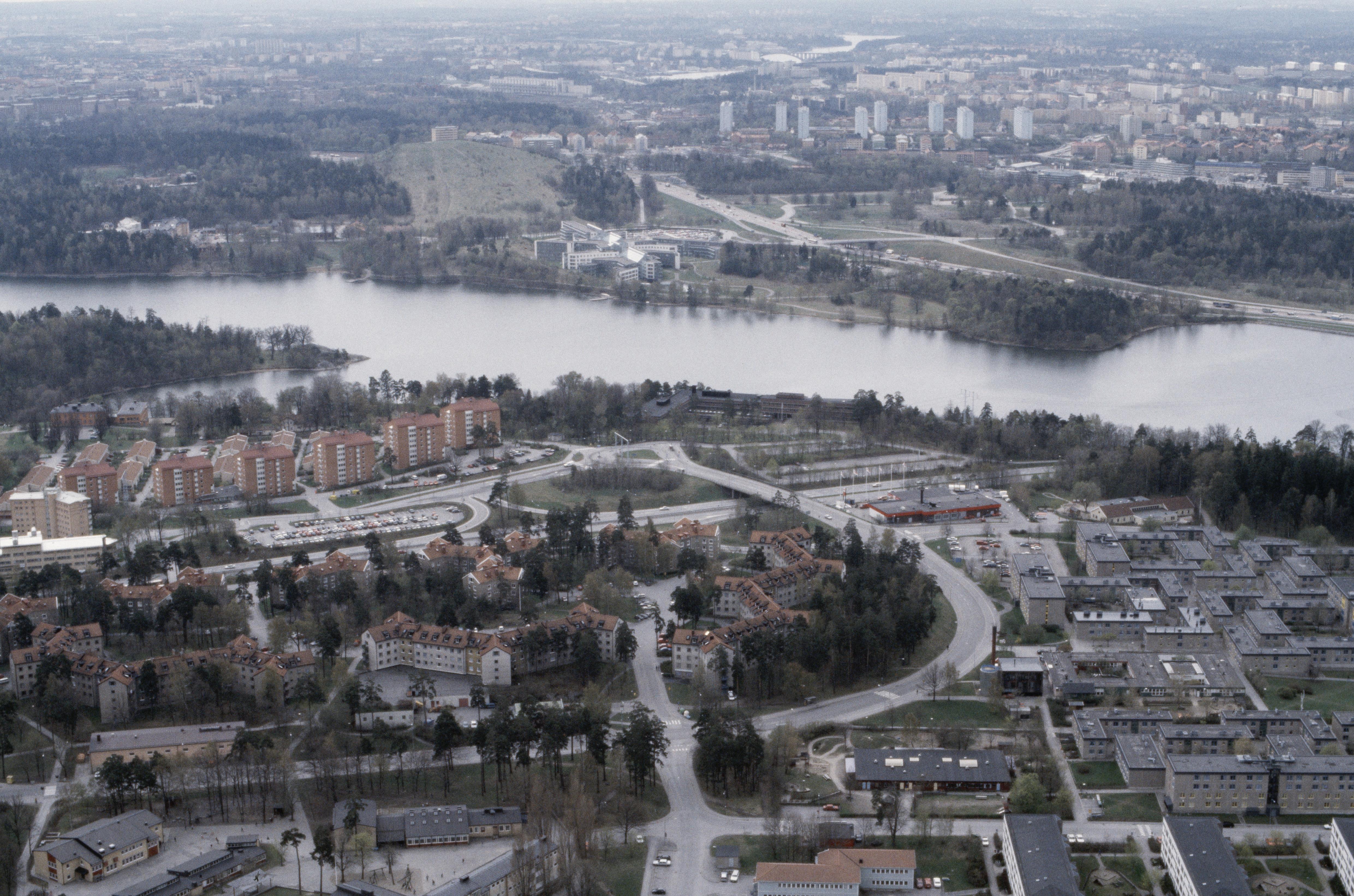 Stadsdelen Bergshamra i Solna vid Brunnsviken. Till vänster om bildens mitt Tivoliuddenn och byggnaderna Statens Växtskyddsanstalt, på Pipersvägen. I bildens övre del Haga slott, Frösundavik och Stockholms stad. Bilden är tagen mot (väderstreck): S