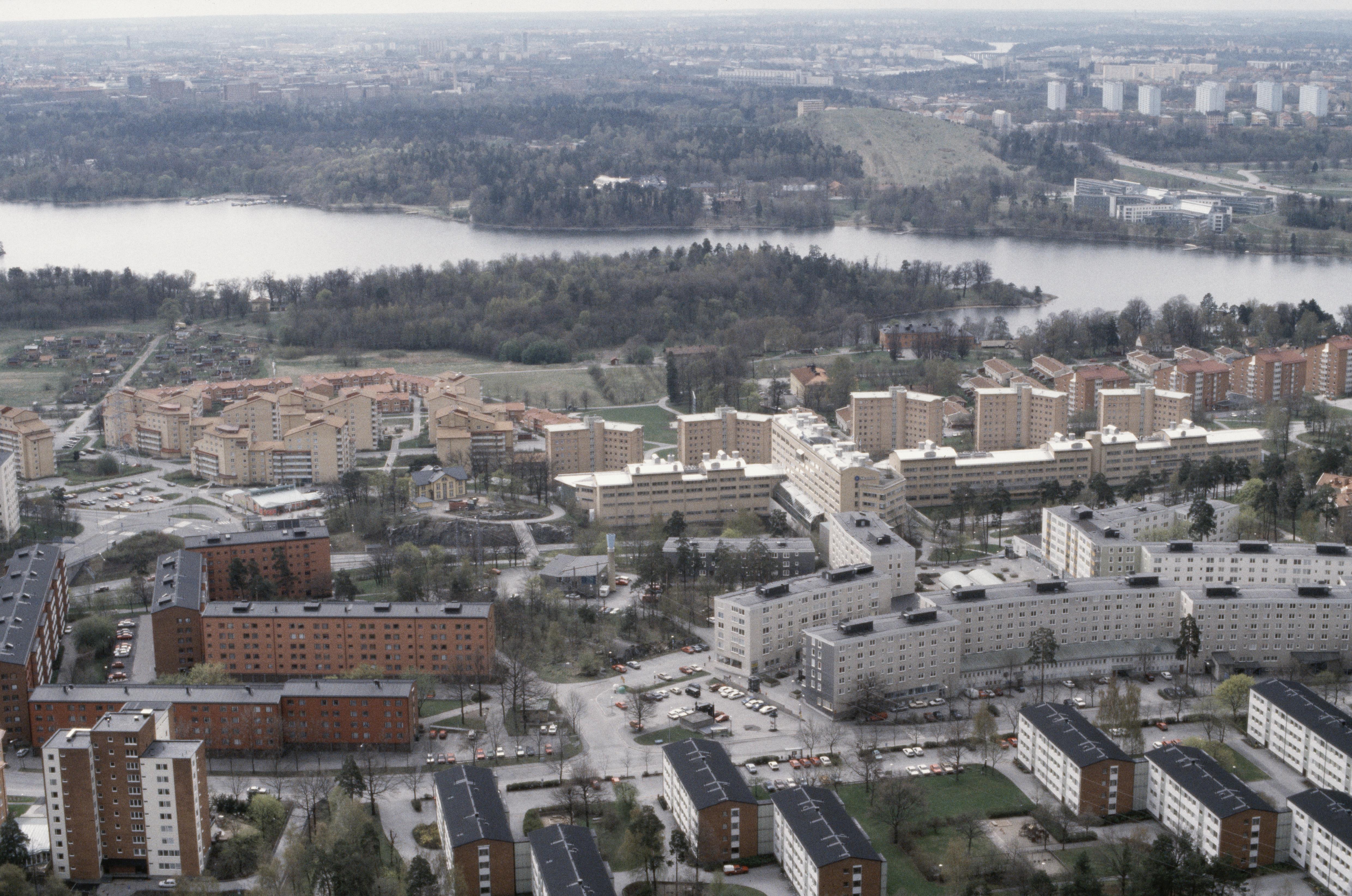 Stadsdelen Bergshamra i Solna vid Brunnsviken. Vid bildens mitt Tivoliudden och byggnaderna Statens Växtskyddsanstalt, på Pipersvägen. I bildens övre del Haga slott, Frösundavik och Stockholms stad. Bilden är tagen mot (väderstreck): S