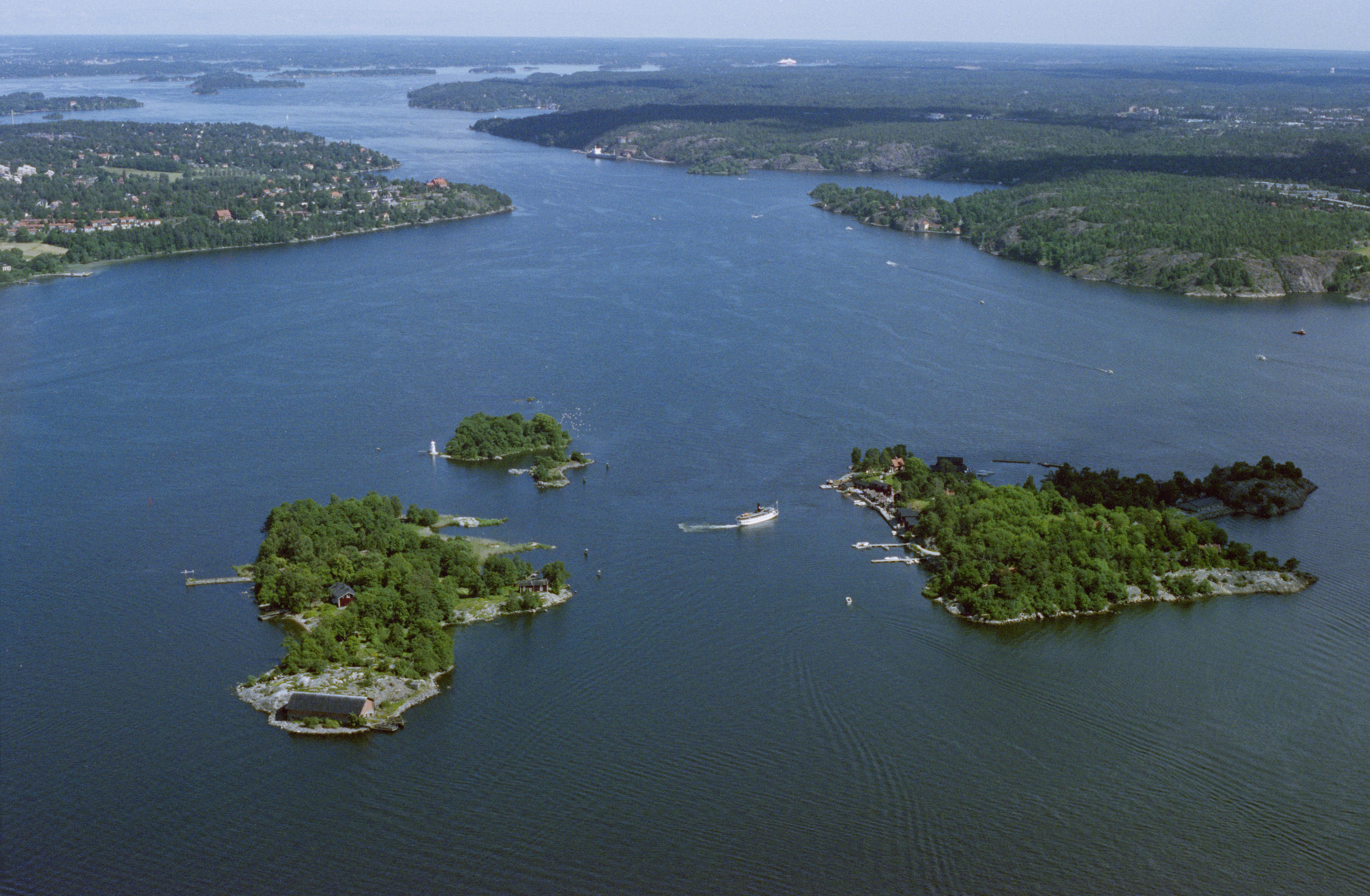 Fjäderholmarna i Stockholms inlopp / farled i fjärden Lilla Värtan. Båtlämningar RAÄnr Lidingö 72, 91,101 m.fl. I bildens övre del Lidingö till vänster, Duvnäs-Utskog i Nacka socken ytterst till höger. Bilden är tagen mot (väderstreck): ONO