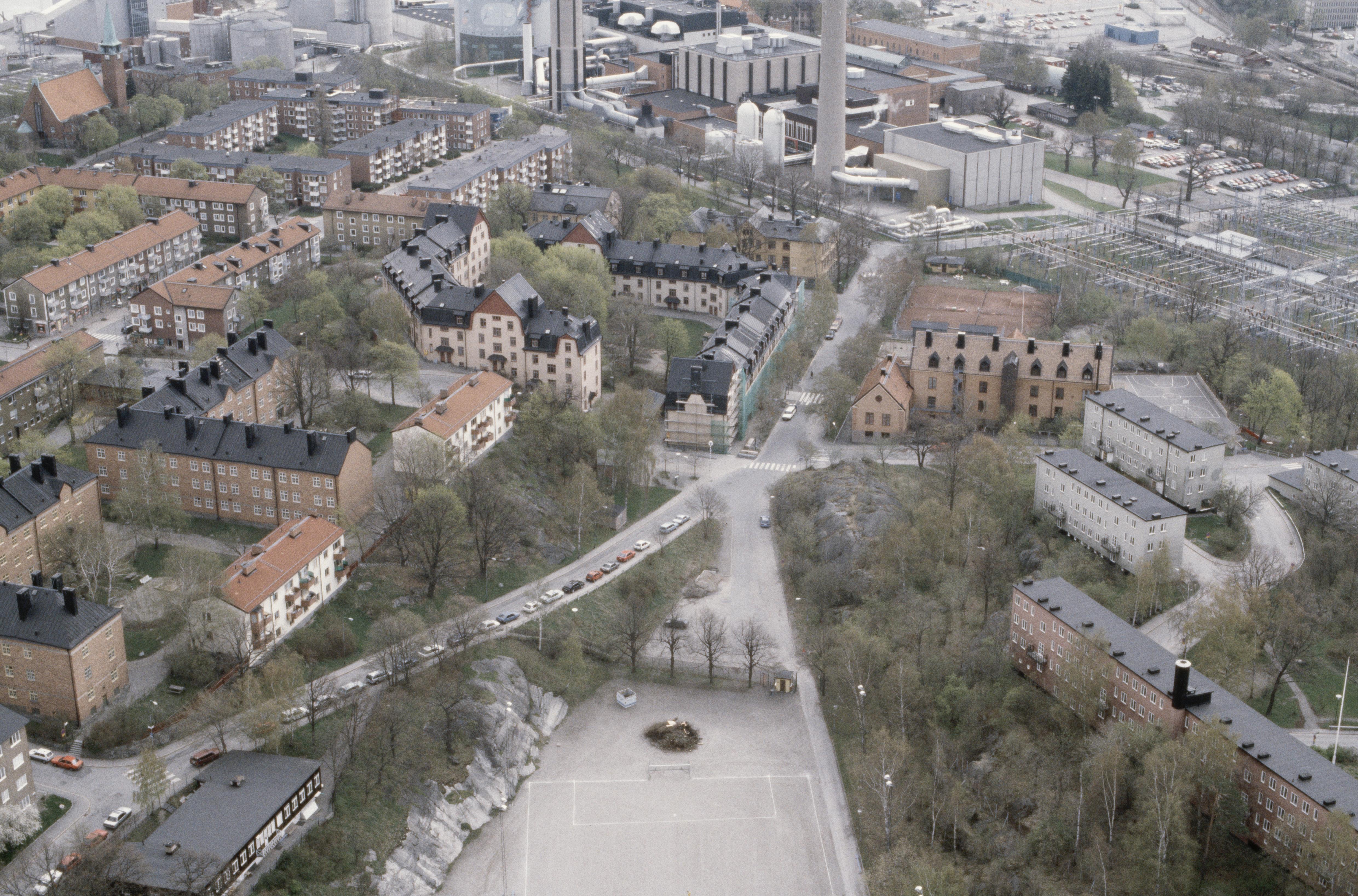 Hjorthagens centrum. Idrottsplatsen och Hjorthagens skola i bildens högra del. Bilden är tagen mot (väderstreck): SO