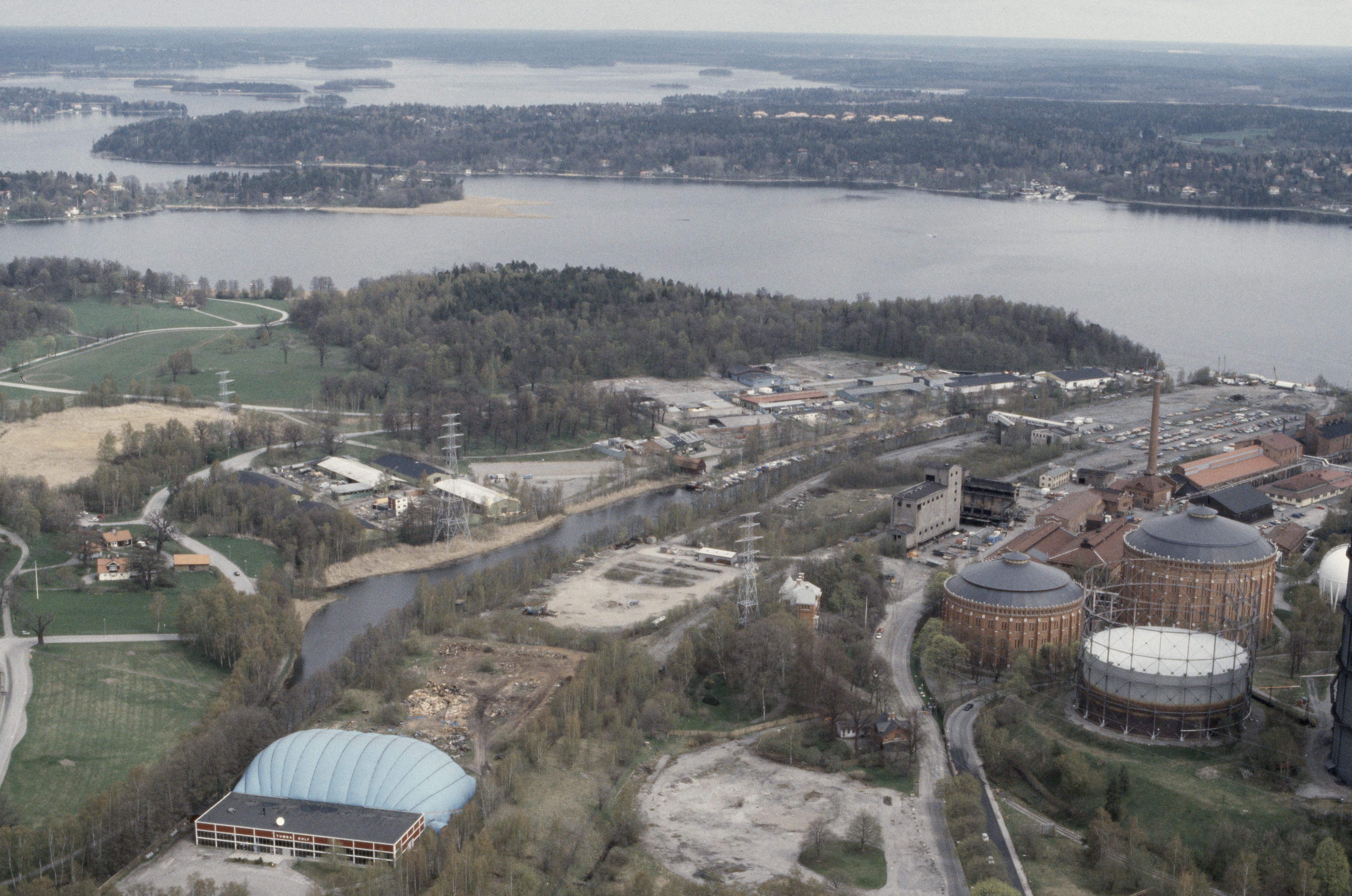 Husarviken vid Hjorthagen, Värtagasverket vid bildens mitt. I bildens övre del fjärden Lilla Värtan mot Lidingö. Bilden är tagen mot (väderstreck): NNO