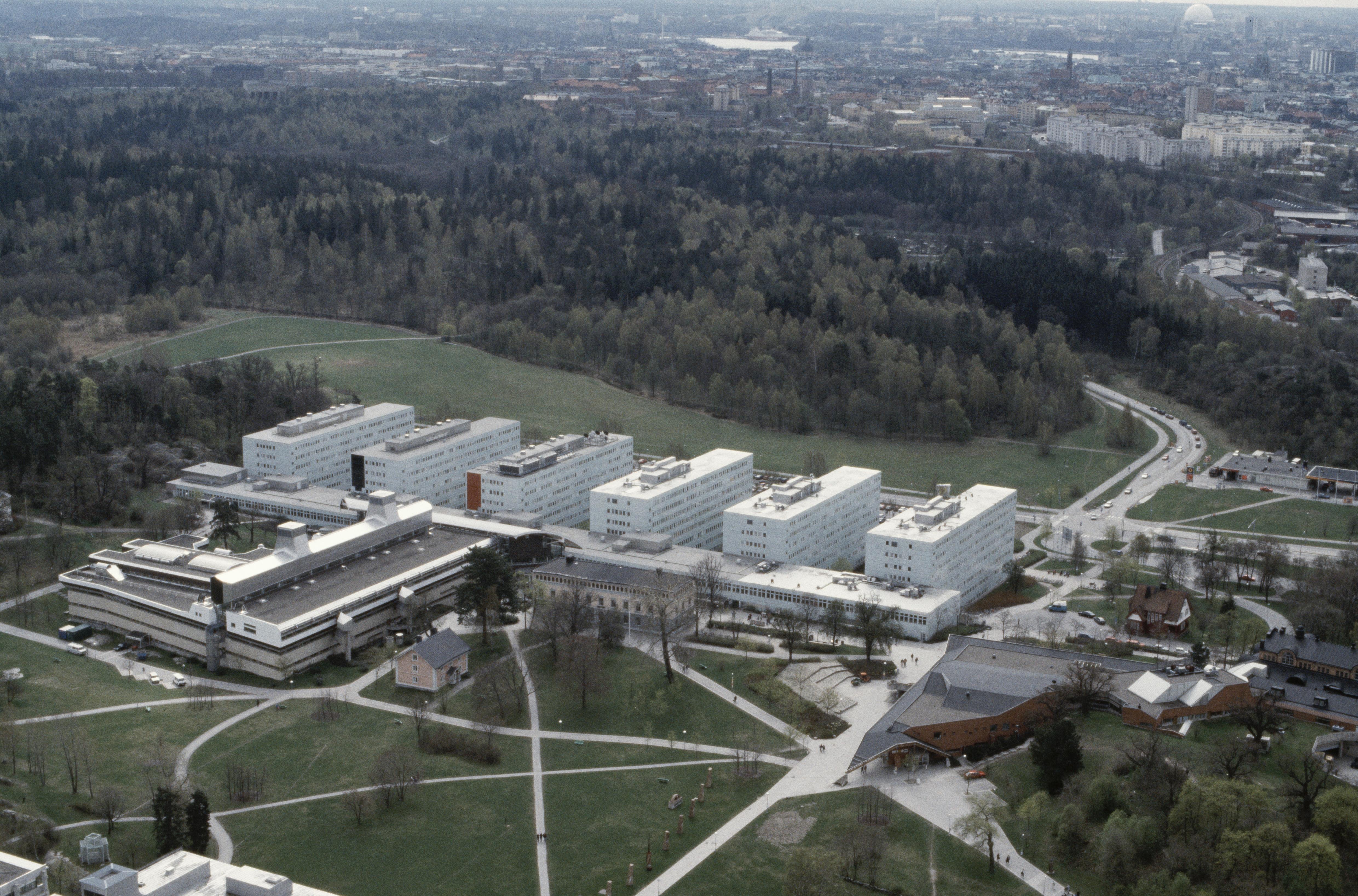 Stockholms universitet. I bildens övre del Brunnsviken, Vasastaden och Stockholms innerstad, Bilden är tagen mot (väderstreck): SV