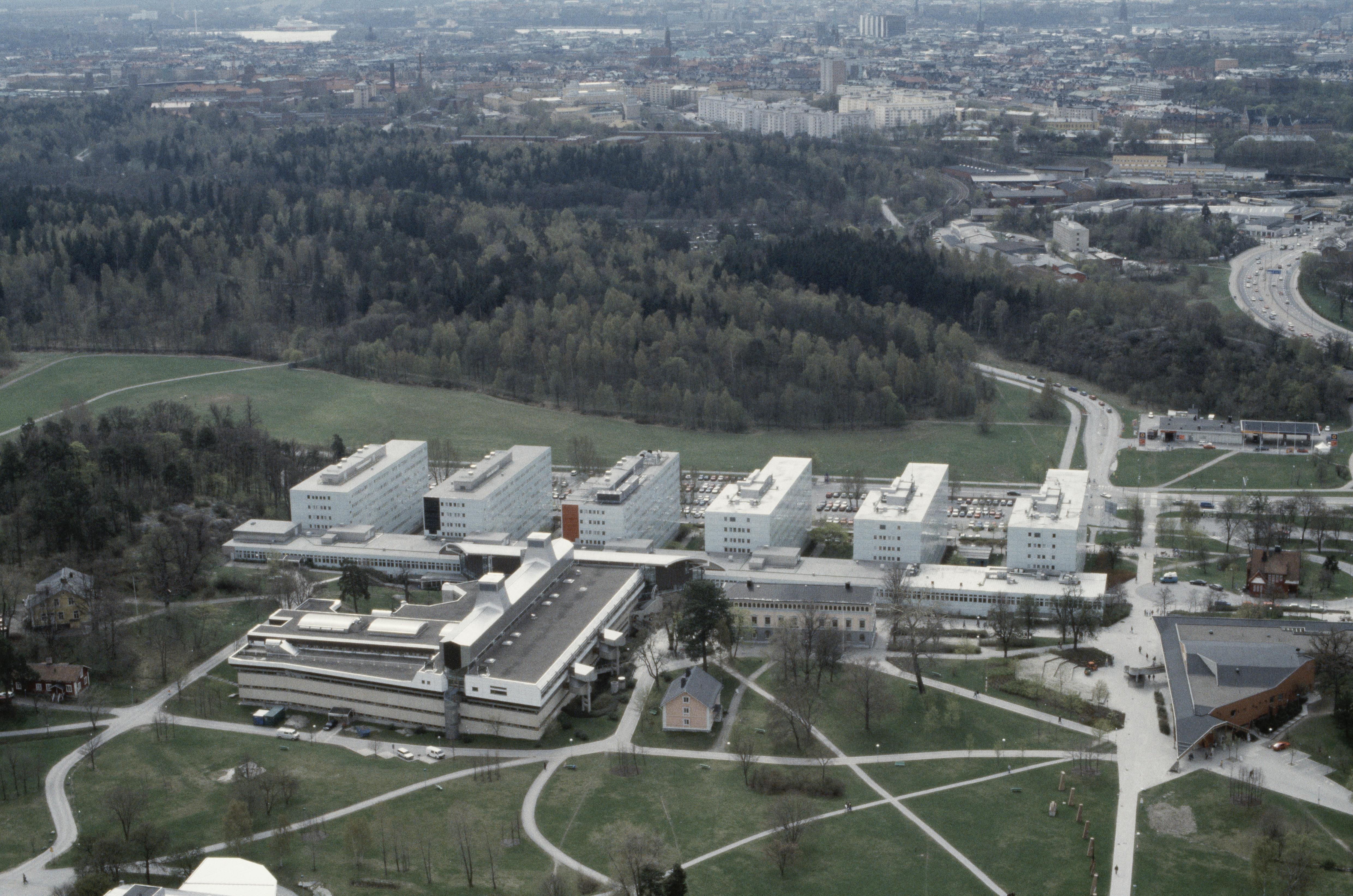 Stockholms universitet. I bildens övre del Brunnsviken, Vasastaden och Stockholms innerstad, Bilden är tagen mot (väderstreck): SSV