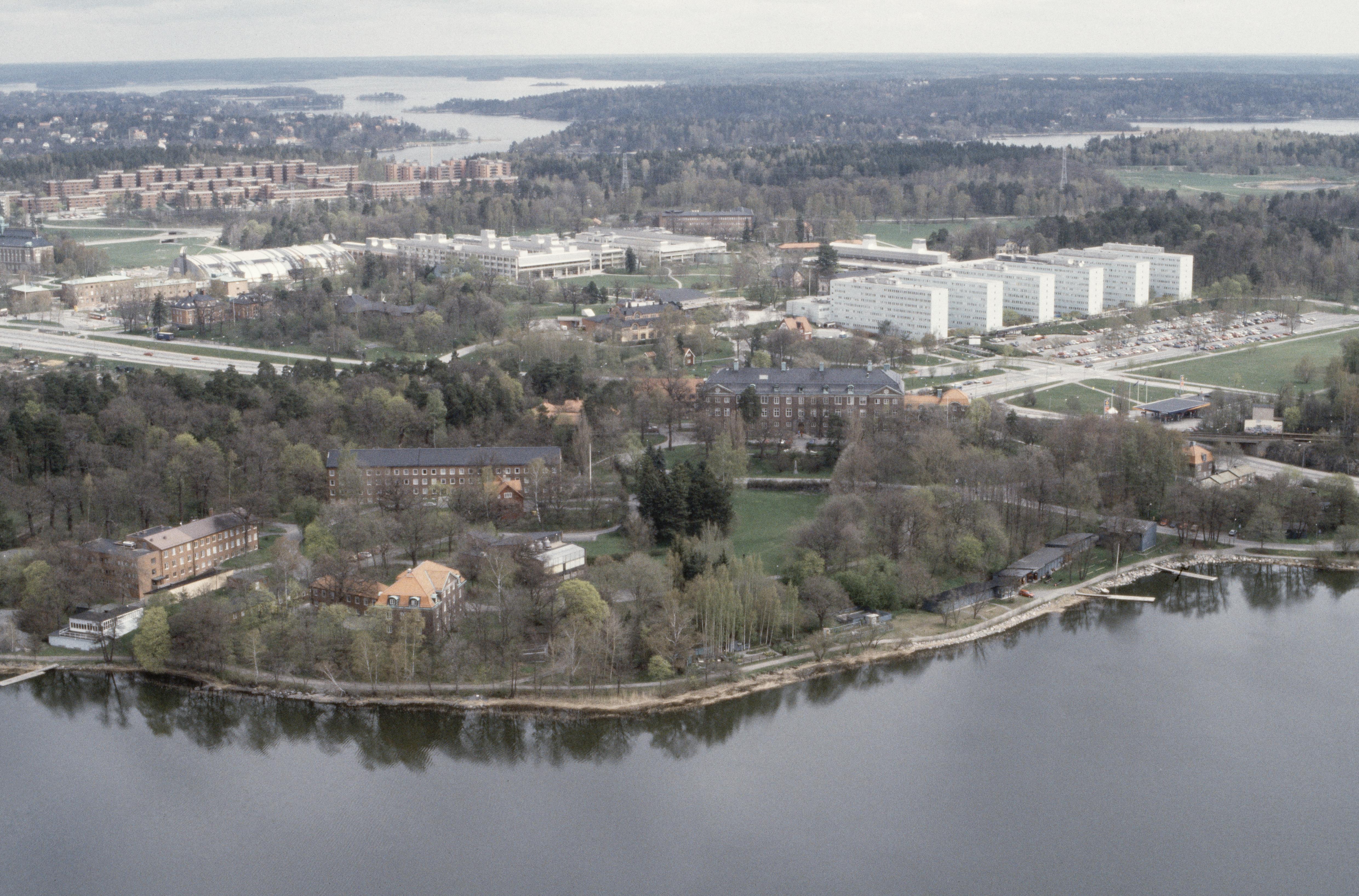 Brunnsviken vid Kräftriket och Lilla Frescati. Under bildens mitt Statens skogforskningsanstalt. Över bildens mitt Stockholms universitet. I bildens övre del Solna och Danderyd. Bilden är tagen mot (väderstreck): NO