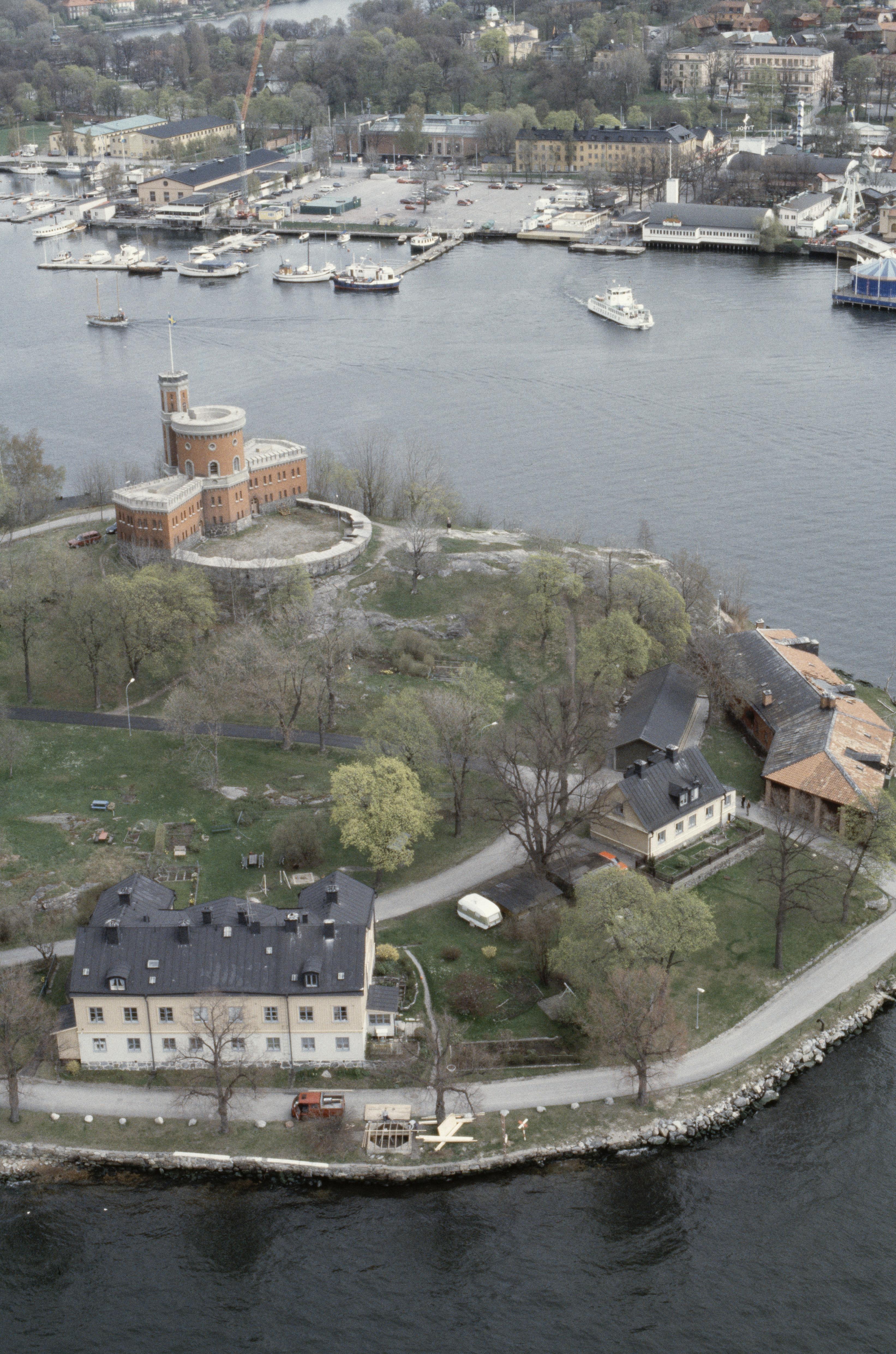 Kastellholmen i Saltsjön. Vid bildens mitt Kastellet, statligt byggnadsminne RAÄnr Stockholm 67:1. I bildens övre del Djurgårdsstaden på Södra Djurgården. Bilden är tagen mot (väderstreck): NNO