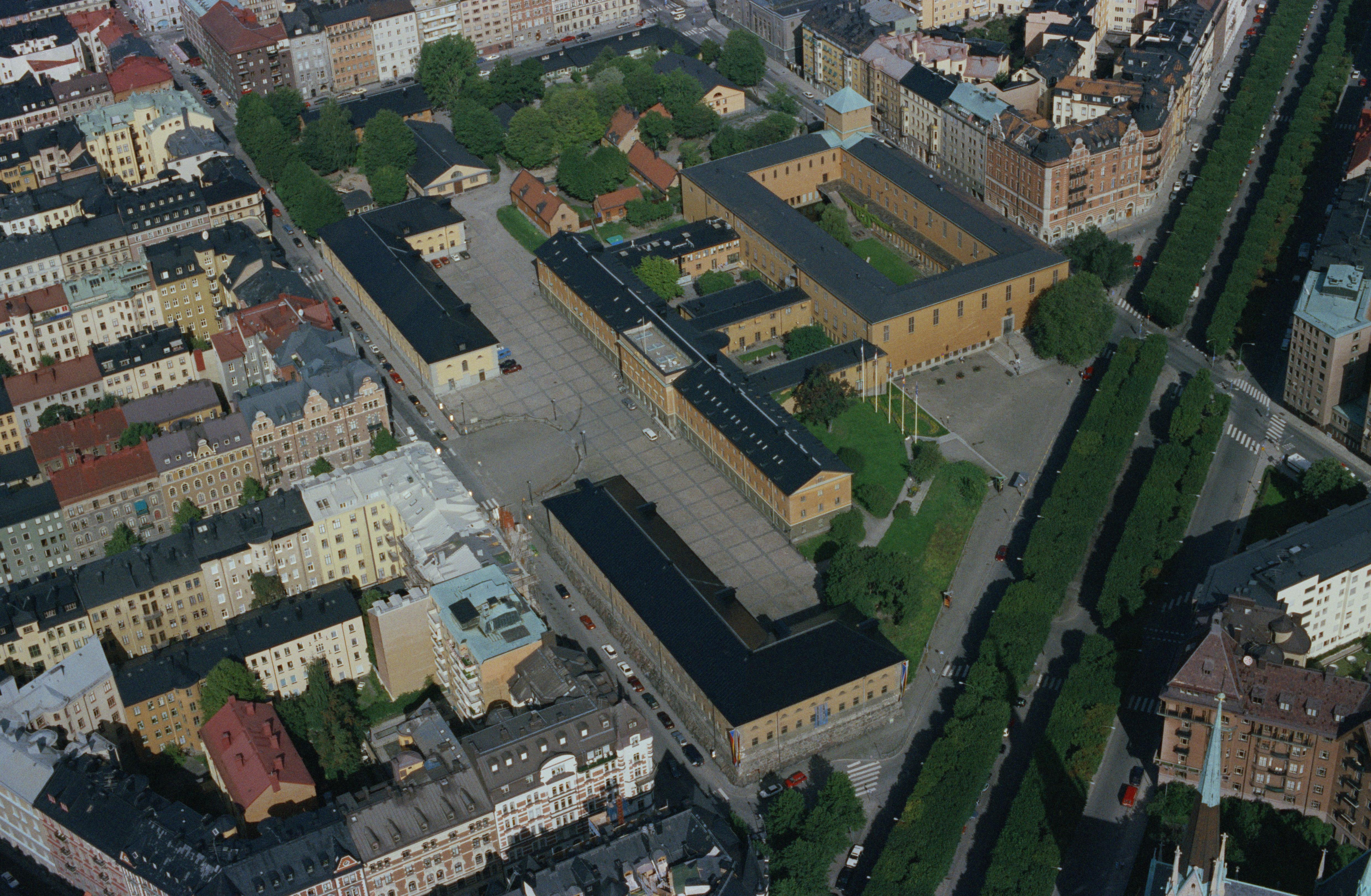 Östermalm. Narvavägen, Storgatan / Kvarteret Krubban med statligt byggnadsminne Oxenstiernska malmgården - RAÄnr Stockholm 73:1 och Statens Historiska Museum (SHM) m.m. I bildens övre del Gärdet och Karlaplan. Bilden är tagen mot (väderstreck): NV