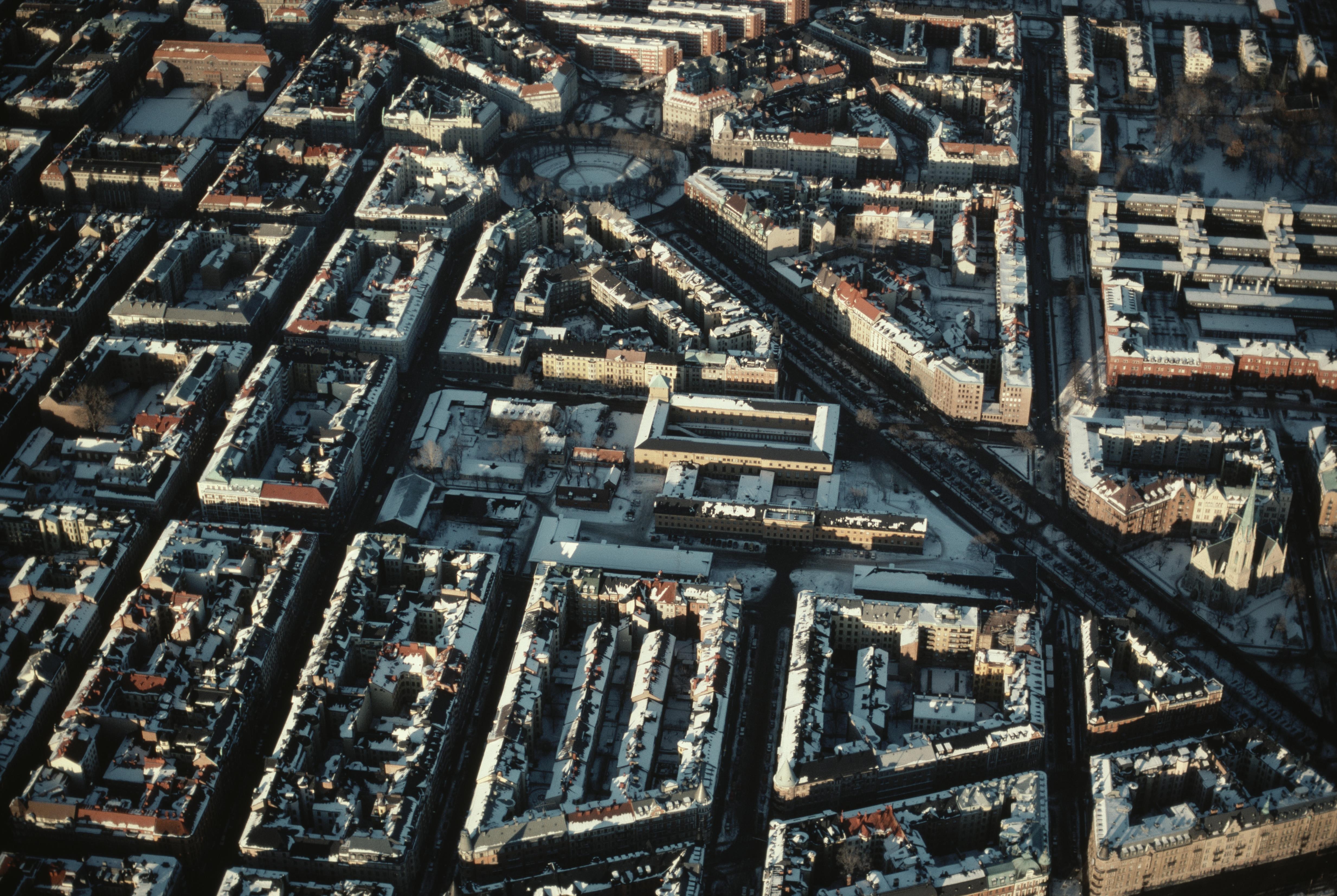 Östermalm. Strandvägen, Riddargatan, Narvavägen med Oscarskyrkan, Storgatan / Kvarteret Krubban med statligt byggnadsminne Oxenstiernska malmgården - RAÄnr Stockholm 73:1 och Statens Historiska Museum (SHM) m.m. I bildens övre del Fältöversten på Karlaplan. Bilden är tagen mot (väderstreck): N