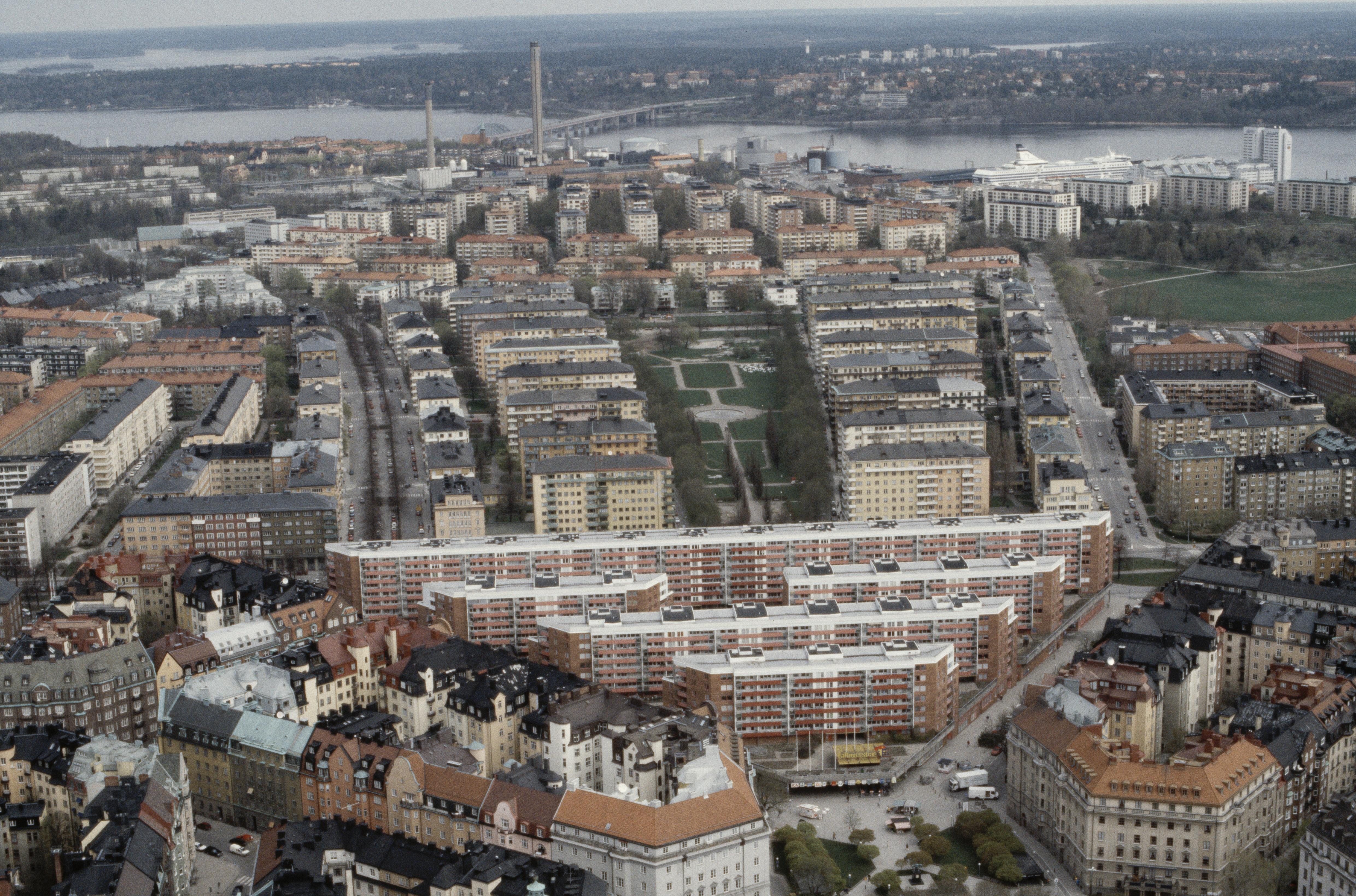 Östermalm. I bildens nedre del Fältöversten köpcentrum- och bostadskvarter på Karlaplan. Vid bildens mitt Tessinparket och Gärdet. I bildens övre del Ladugårdsgärdet / Gärdet, Hjorthagen, Värtahamnen, Lidingöbron över fjärden Lilla Värtan, Lidingö socken. Bilden är tagen mot (väderstreck): NNO