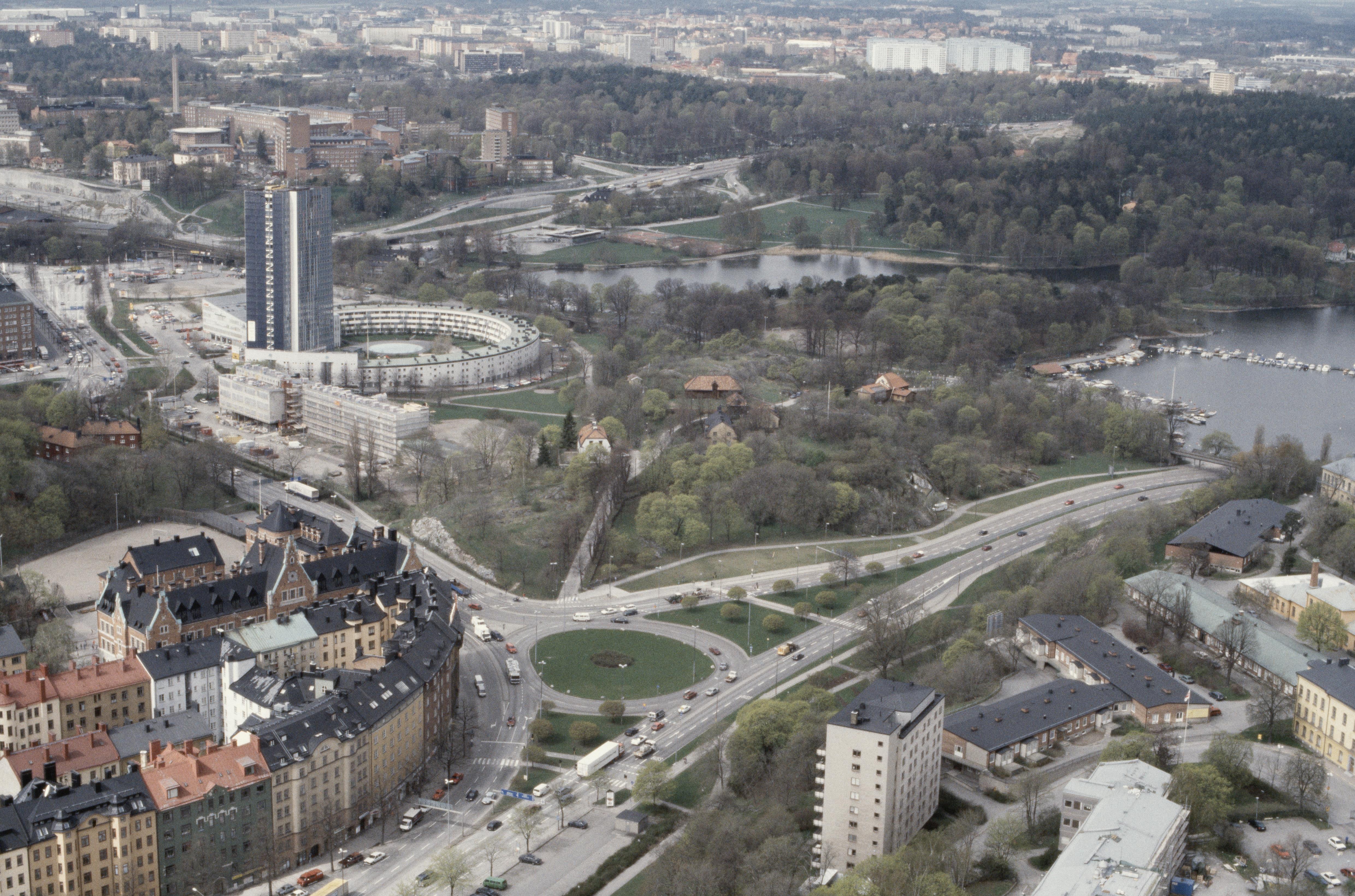 Vasastaden med Roslagstull och Wenner-Gren Center på Sveaplan vid Brunnsvikens södra del. Uppe till höger Solna socken med bostadsområdet Hagalund och slottsområdena Gamla Haga och Hagaparken. Bilden är tagen mot (väderstreck): VNV