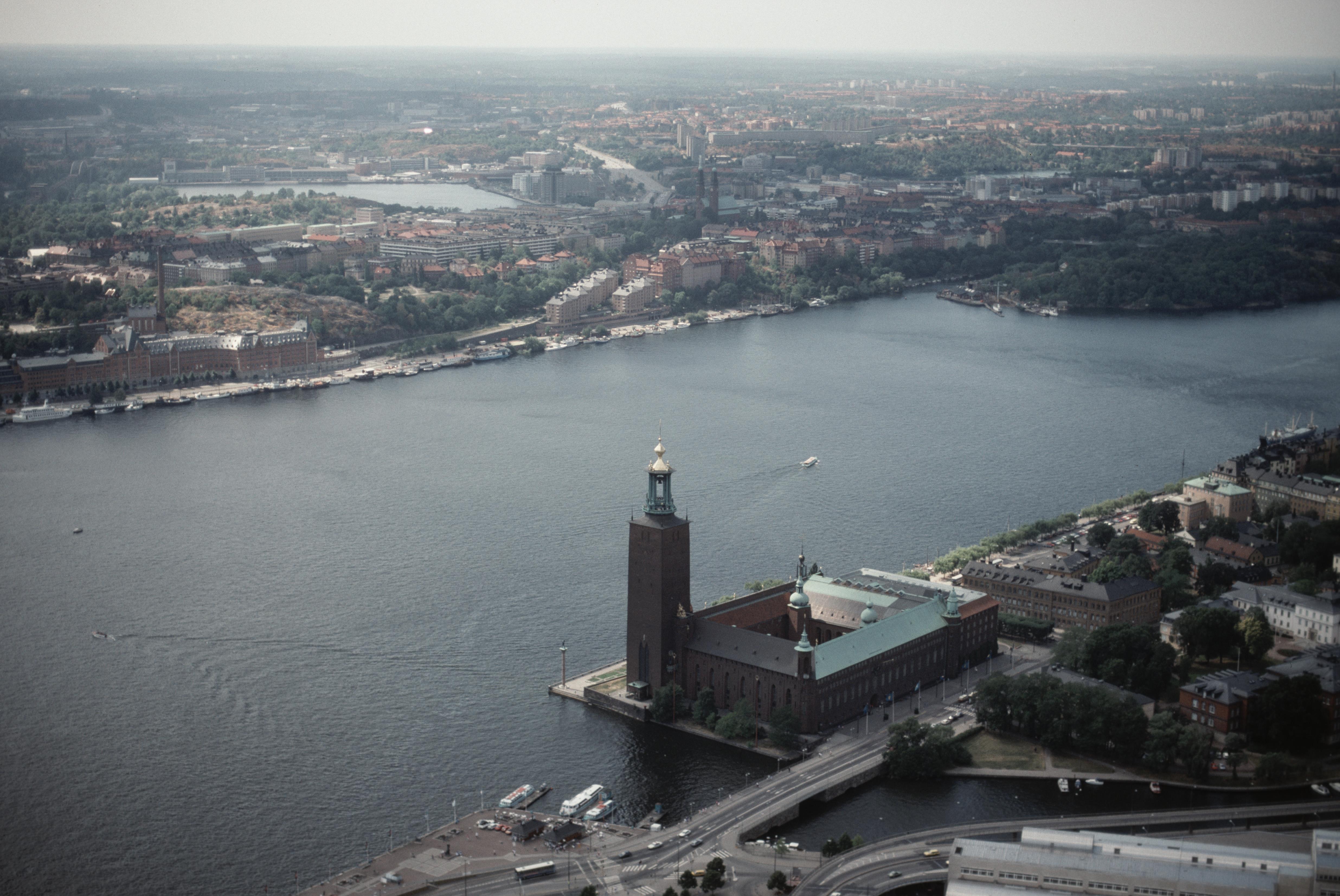 Kungsholmen vid Riddarfjärden i Mälaren. Stockholms stadshus RAÄnr Stockholm 27:1 vid bildens mitt. I bildens övre del Södermalm. Bilden är tagen mot (väderstreck): SV