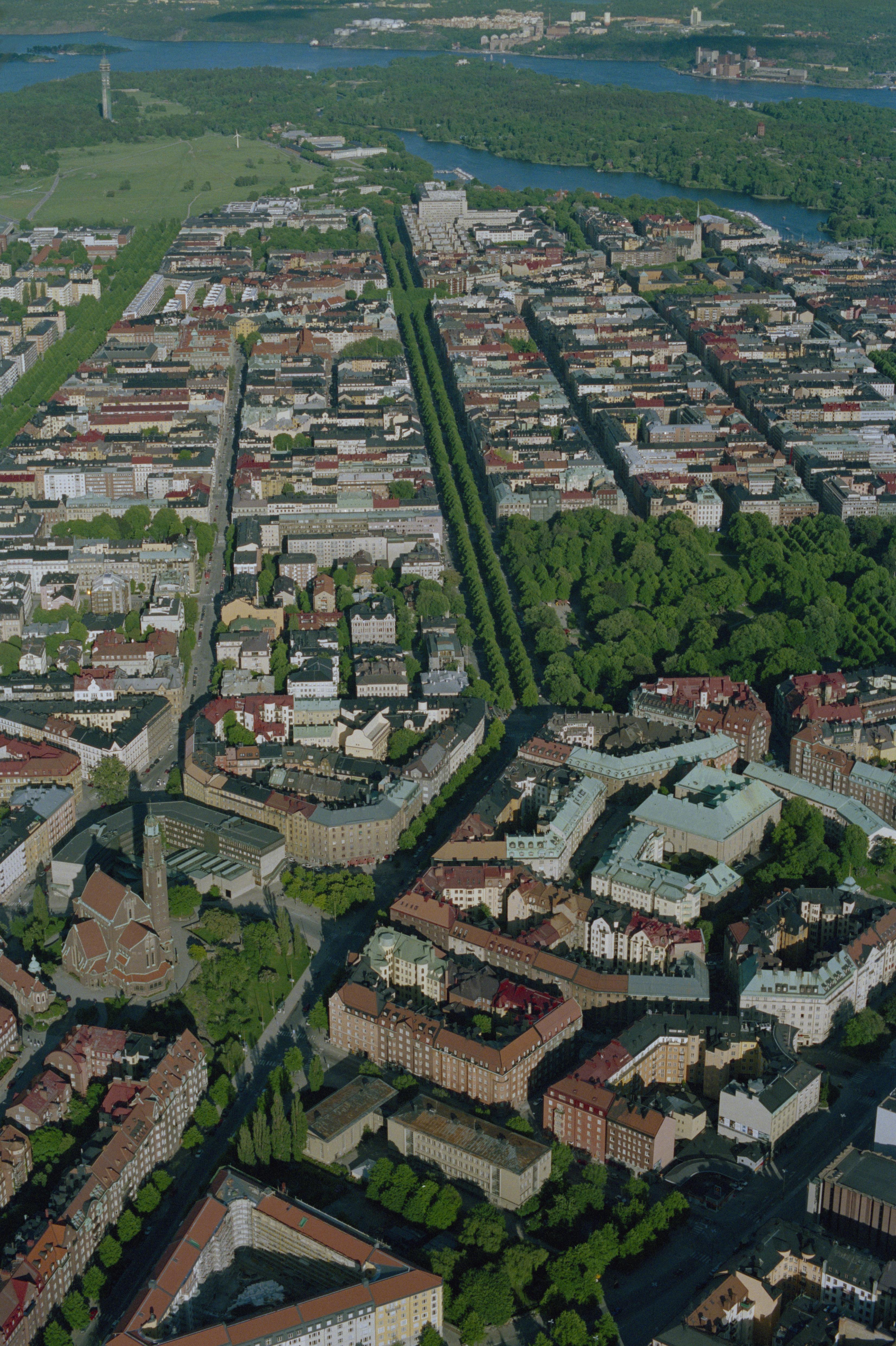 Östermalm. Nere till vänster Engelbrektskyrkan i Lärkstaden. Humlegården til höger om bildens mitt. Karlavägen mot Gärdet. I bildens övre del Södra Djurgården med Ladugårdsgärdet, Kaknästornet m.m. Bilden är tagen mot (väderstreck): OSO