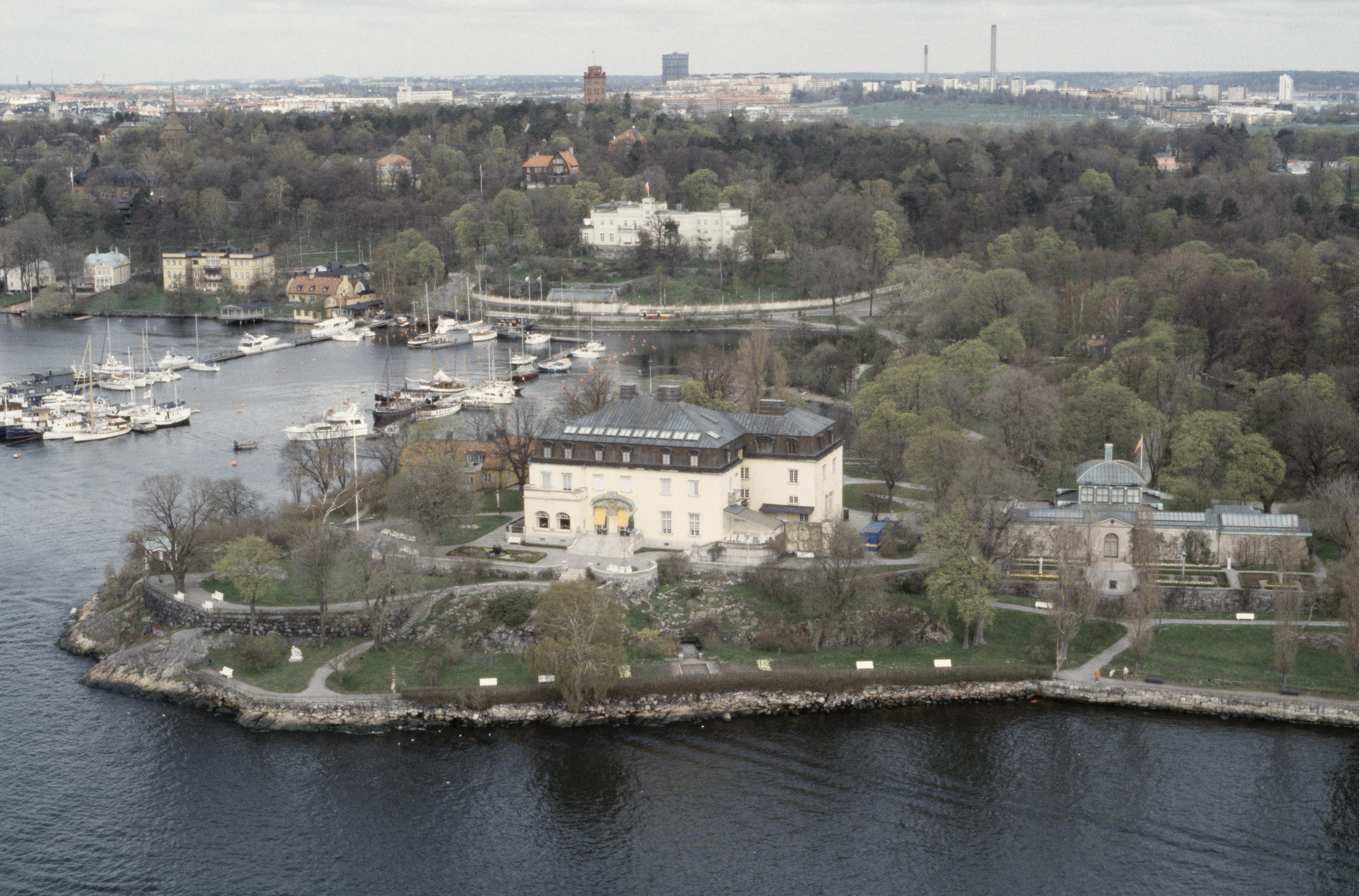 Valdemarsudde och Frisens park vid Ryssviken i Saltsjön. Vid bildens mitt konstmuseet Prins Eugens Waldemarsudde - statligt byggnadsminne RAÄnr Stockholm 12:1. I bildens övre del palatset Oakhill. Bilden är tagen mot (väderstreck): NNV