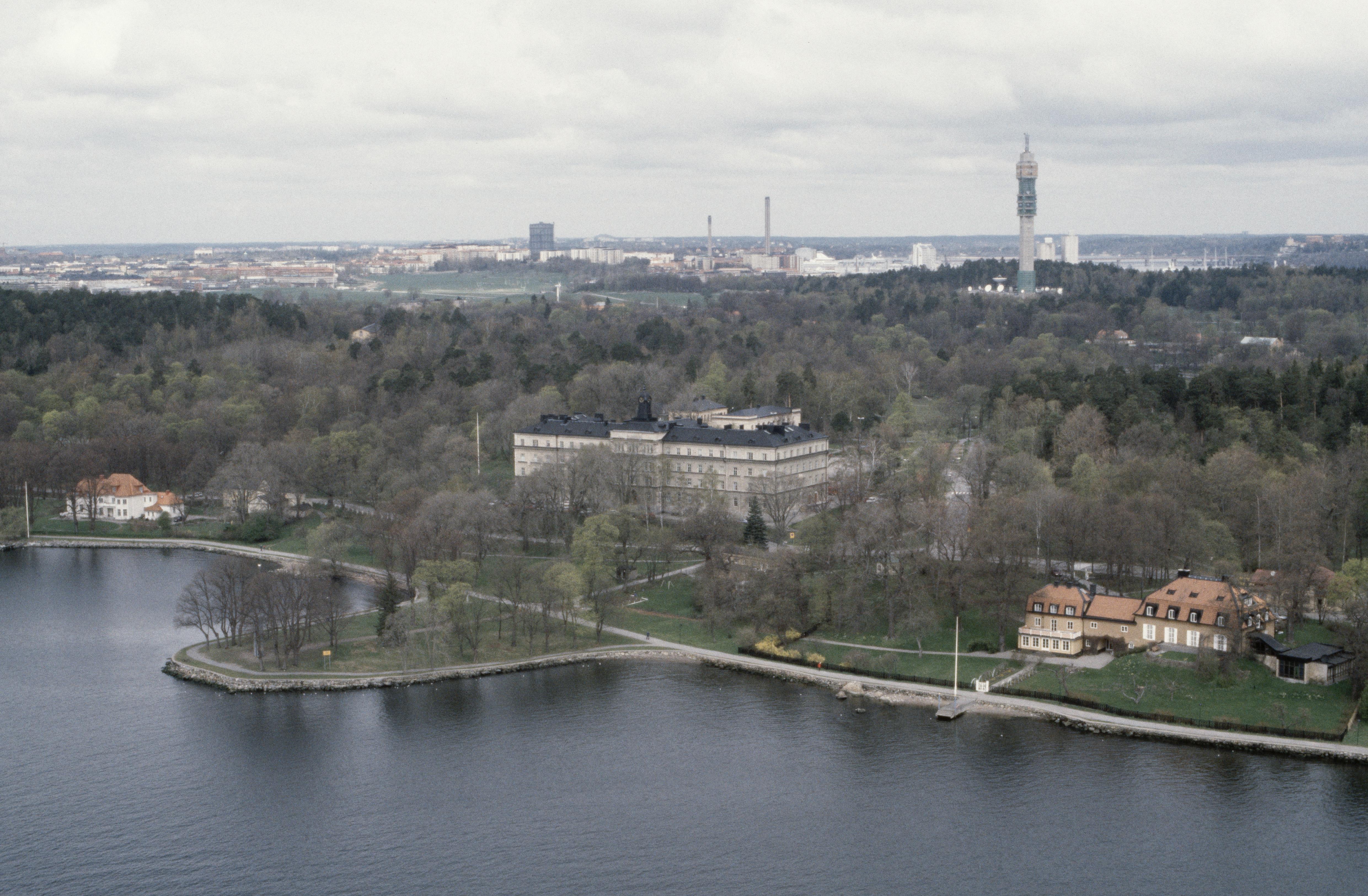 Manillaskolan vid bildens mitt. Till höger om skolan Nedre Manilla lusthus - statligt byggnadsminne RAÄnr Stockholm 131:1. I bildens övre del Ladugårdsgärdet med Kaknästornet, Norra Djurgården m.m. Bilden är tagen mot (väderstreck): NNV