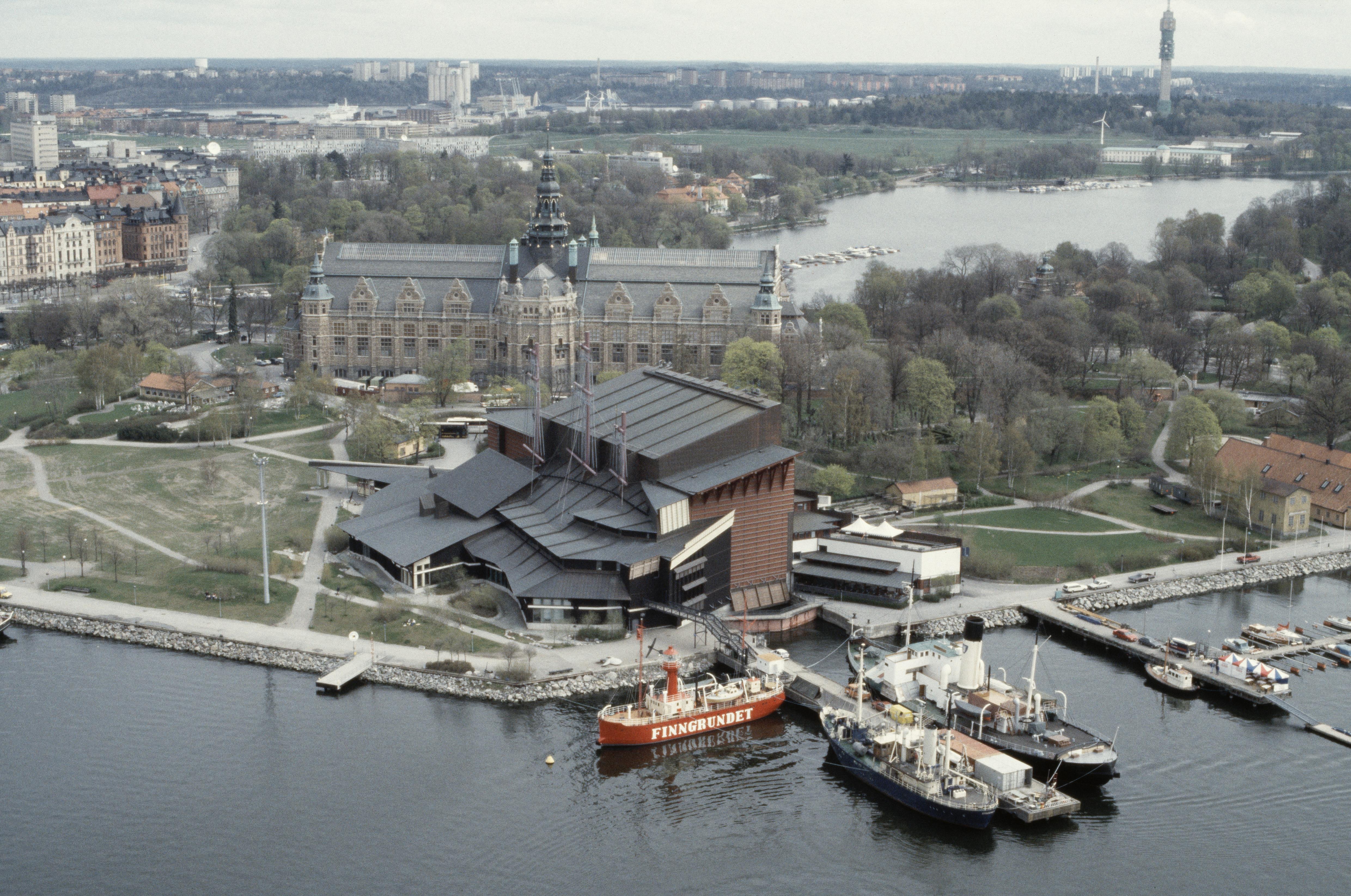 Vasamuseet vid Saltsjön i bildens nedre del. Vid bildens mitt Nordiska museet - statligt byggnadsminne RAÄnr Stockholm 89:1. I bildens övre del Östermalm med Strandvägen, Djurgårdsbrunnsviken, Norra Djurgården med Ladugårdsgärdet mot Norra Djurgården. Bilden är tagen mot (väderstreck): NO