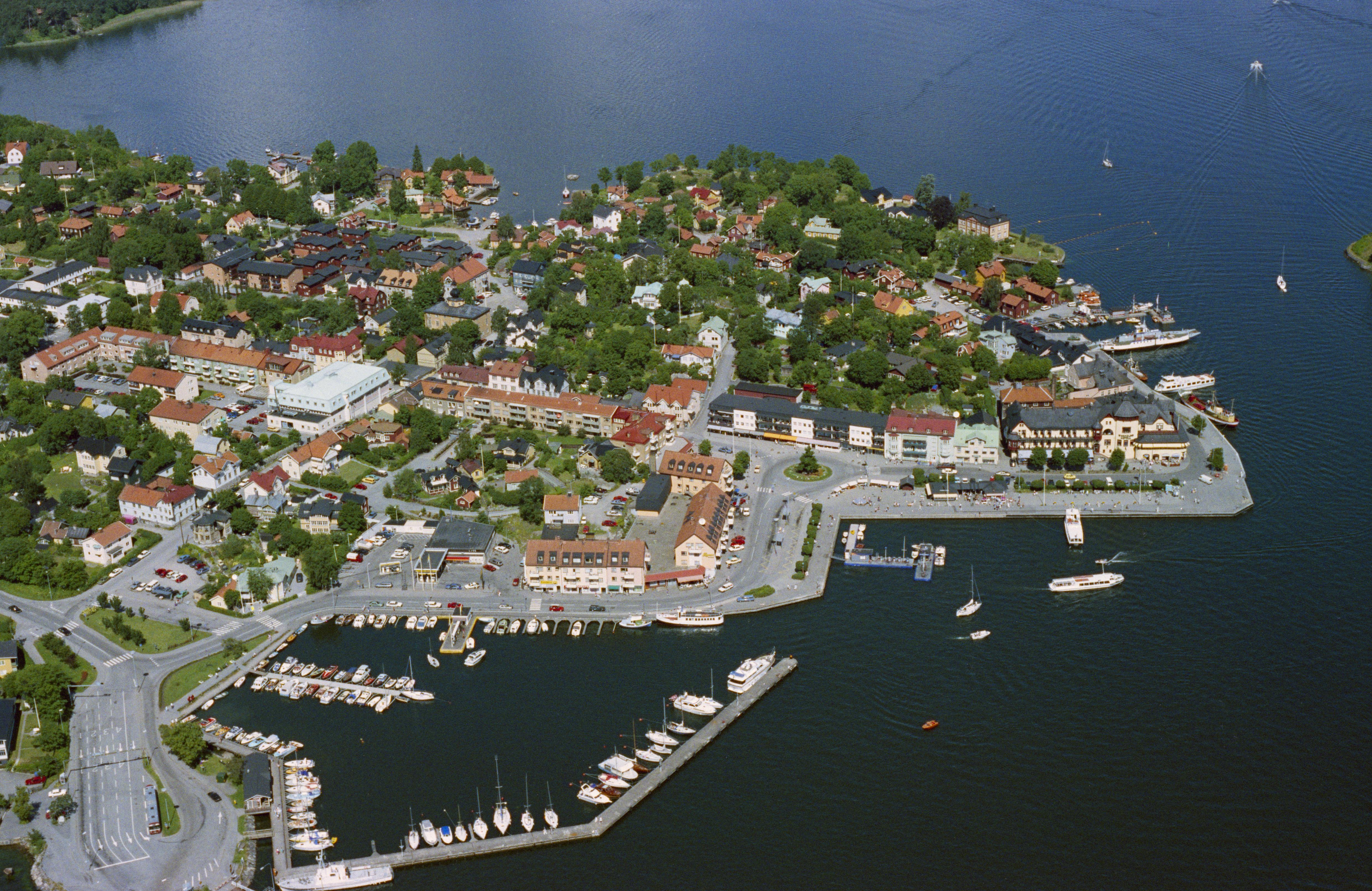 Vaxholms tätort vid Vaxholmsfjärden. Hamnområdet. Bilden är tagen mot (väderstreck): N