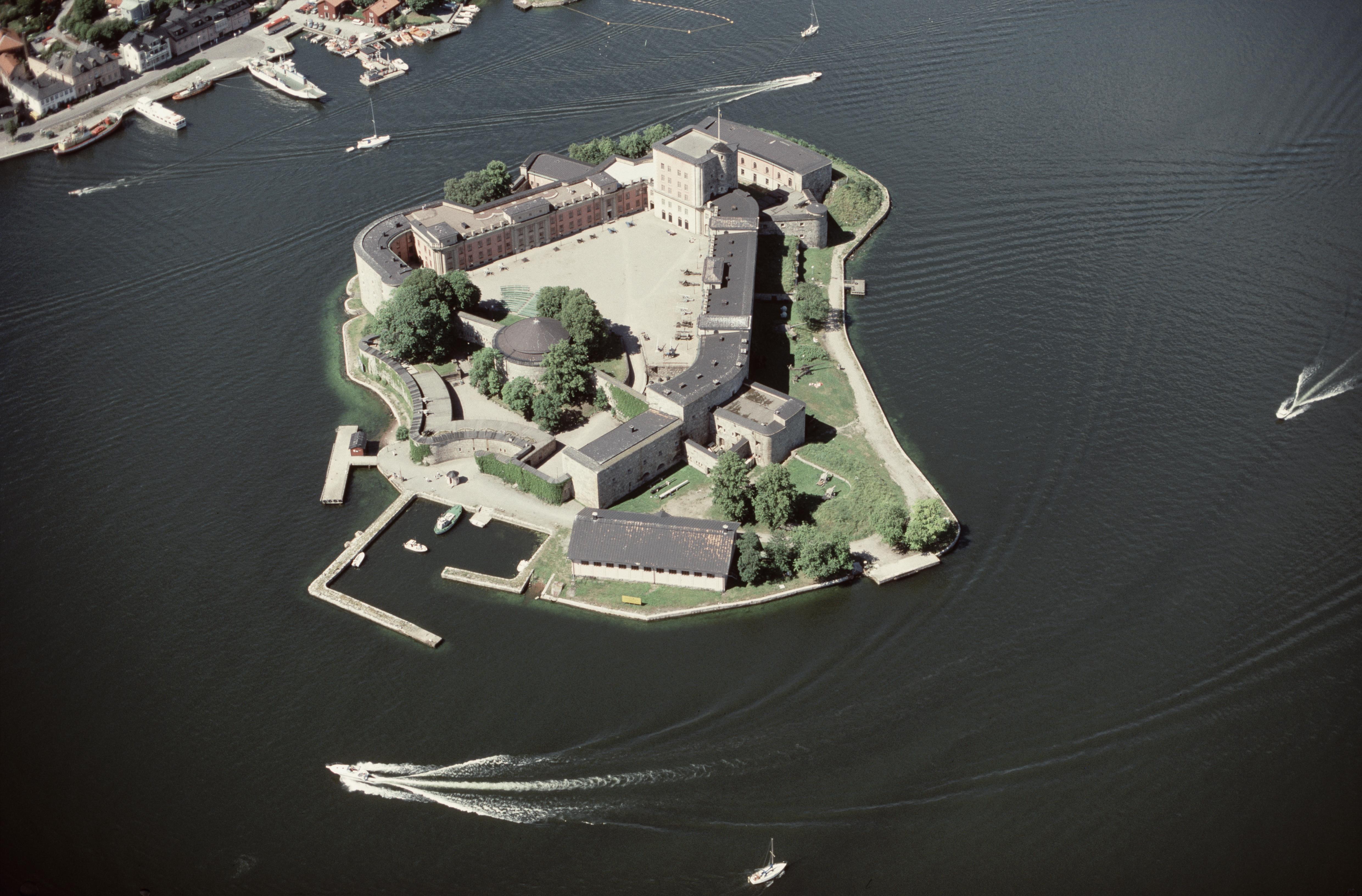 Ön Vaxholmen i Vaxholmsfjärden. På ön Vaxholms fästning / Vaxholms kastell - statligt byggnadsminne RAÄnr Vaxholm 11:1. Uppe till vänster tätorten Vaxholm. Bilden är tagen mot (väderstreck): NV