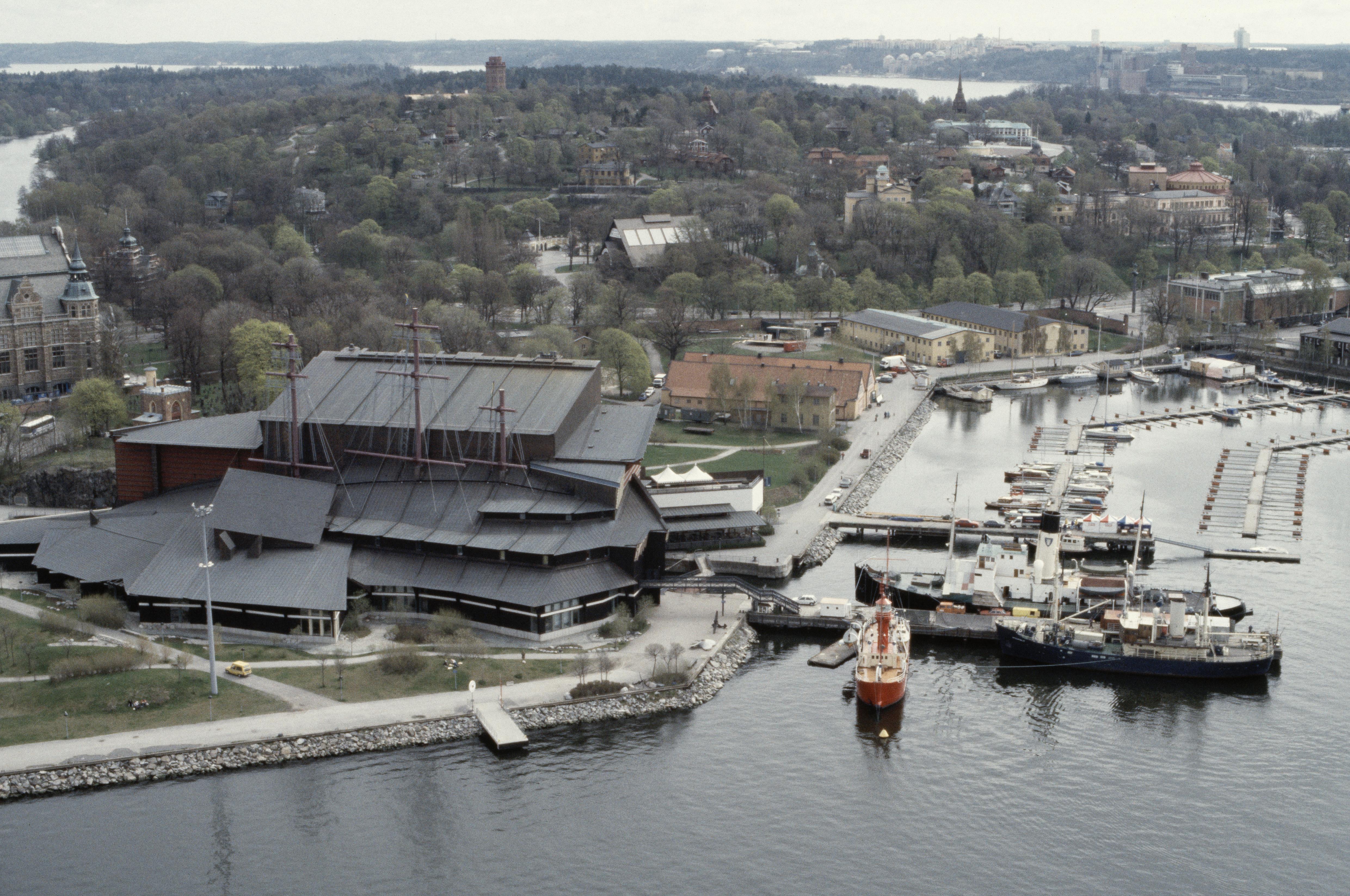 Vasamuseet vid Saltsjön. Till vänster Nordiska museet statligt byggnadsminne RAÄnr Stockholm 89:1. Biologiska museet vid bildens mitt. I bildens övre del friluftsmuseet Skansen mot fjärden Lilla Värtan och Lidingö socken. Bilden är tagen mot (väderstreck): Ö