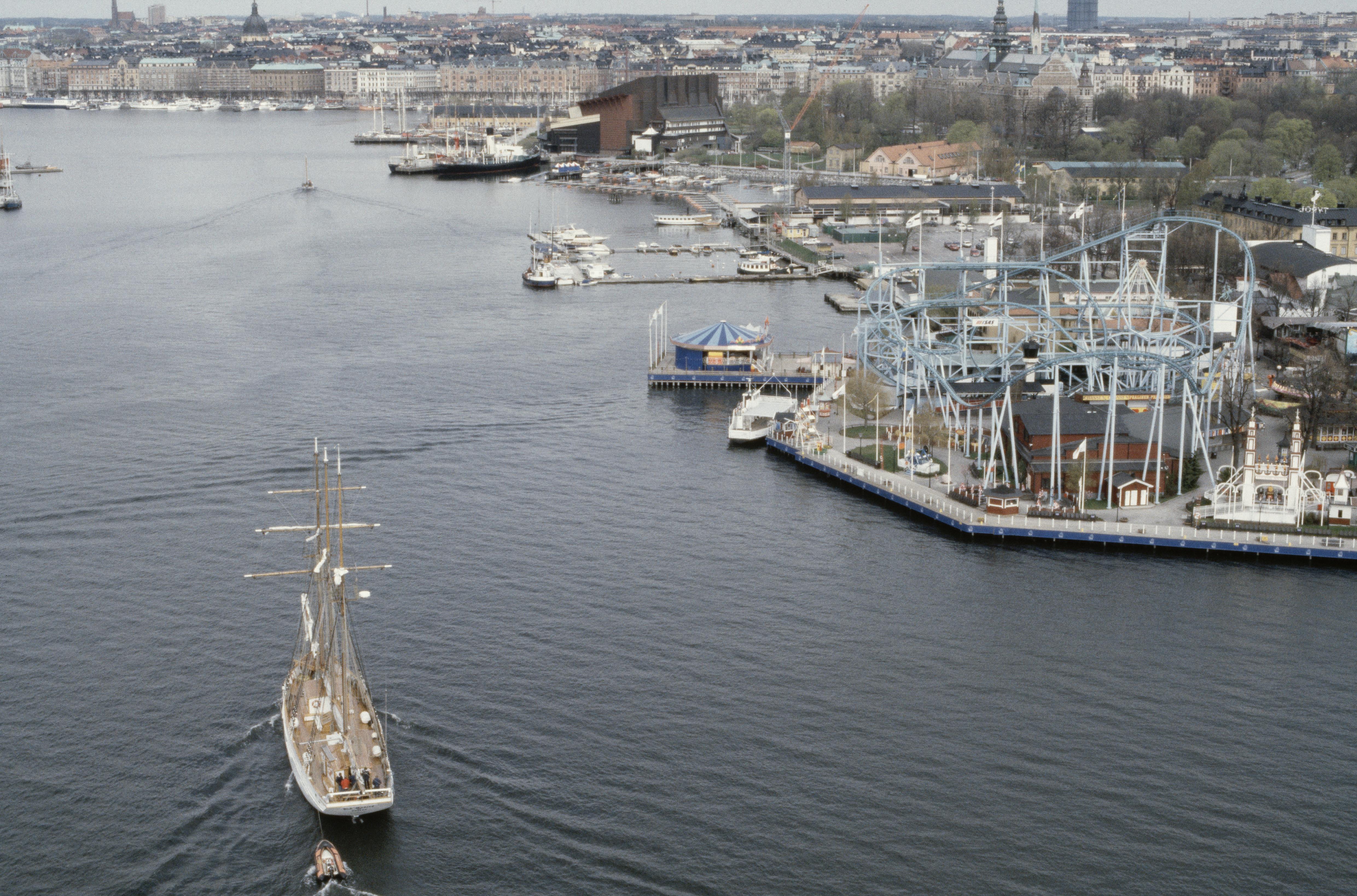 Båten / segelfartyget "Blå Marité" i Saltsjön vid nöjesfältet Gröna Lund. I bildens övre del Vasamuseet och Nordiska museet, Stockholms innerstad / Östermalm med Strandvägen m.m. Bilden är tagen mot (väderstreck): NNV