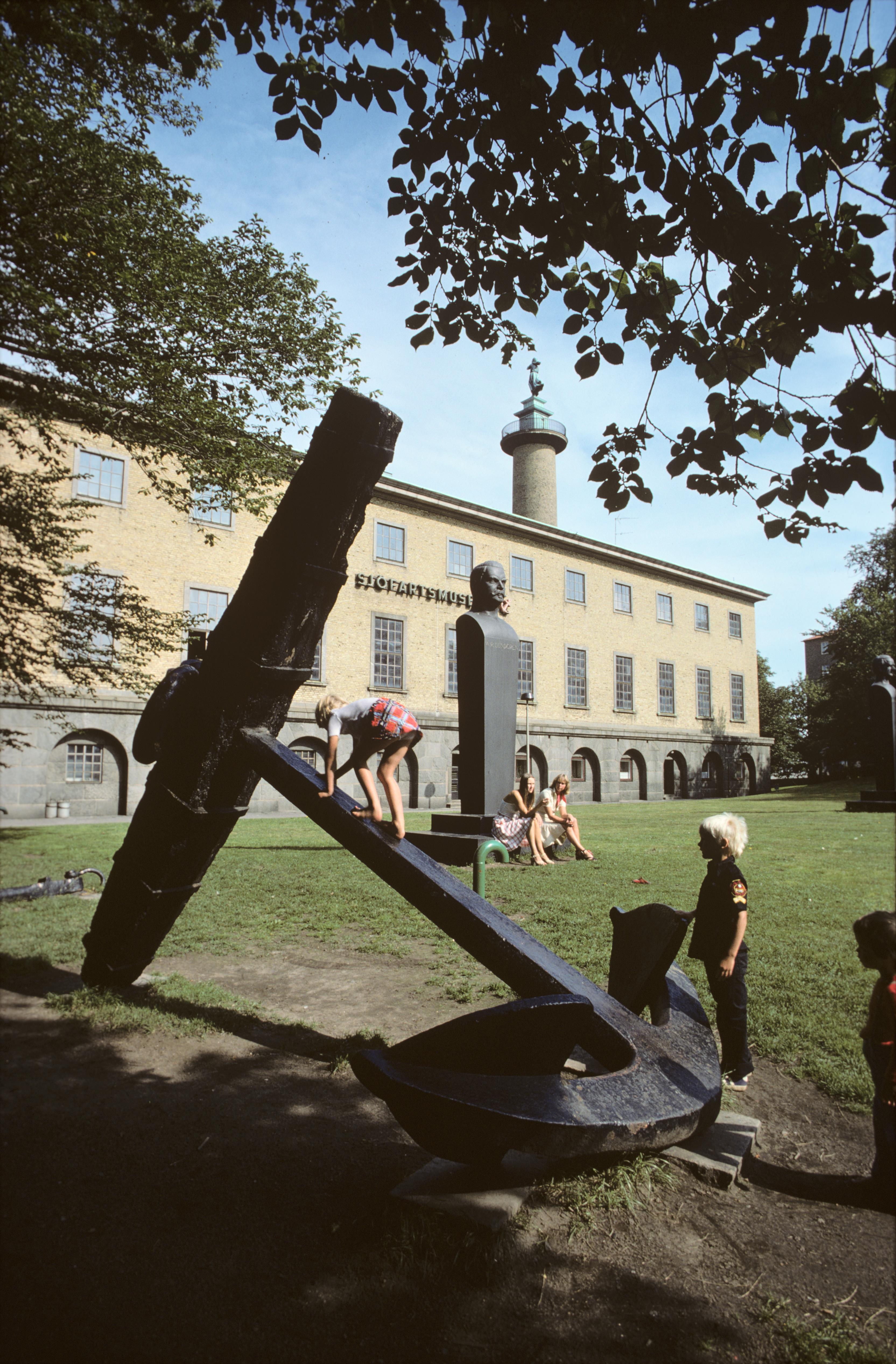 Ankare, lekande barn och byst över Dan Broström i förgrunden. Bakom Sjöfartsmuseet syns statyn Kvinna vid havet.