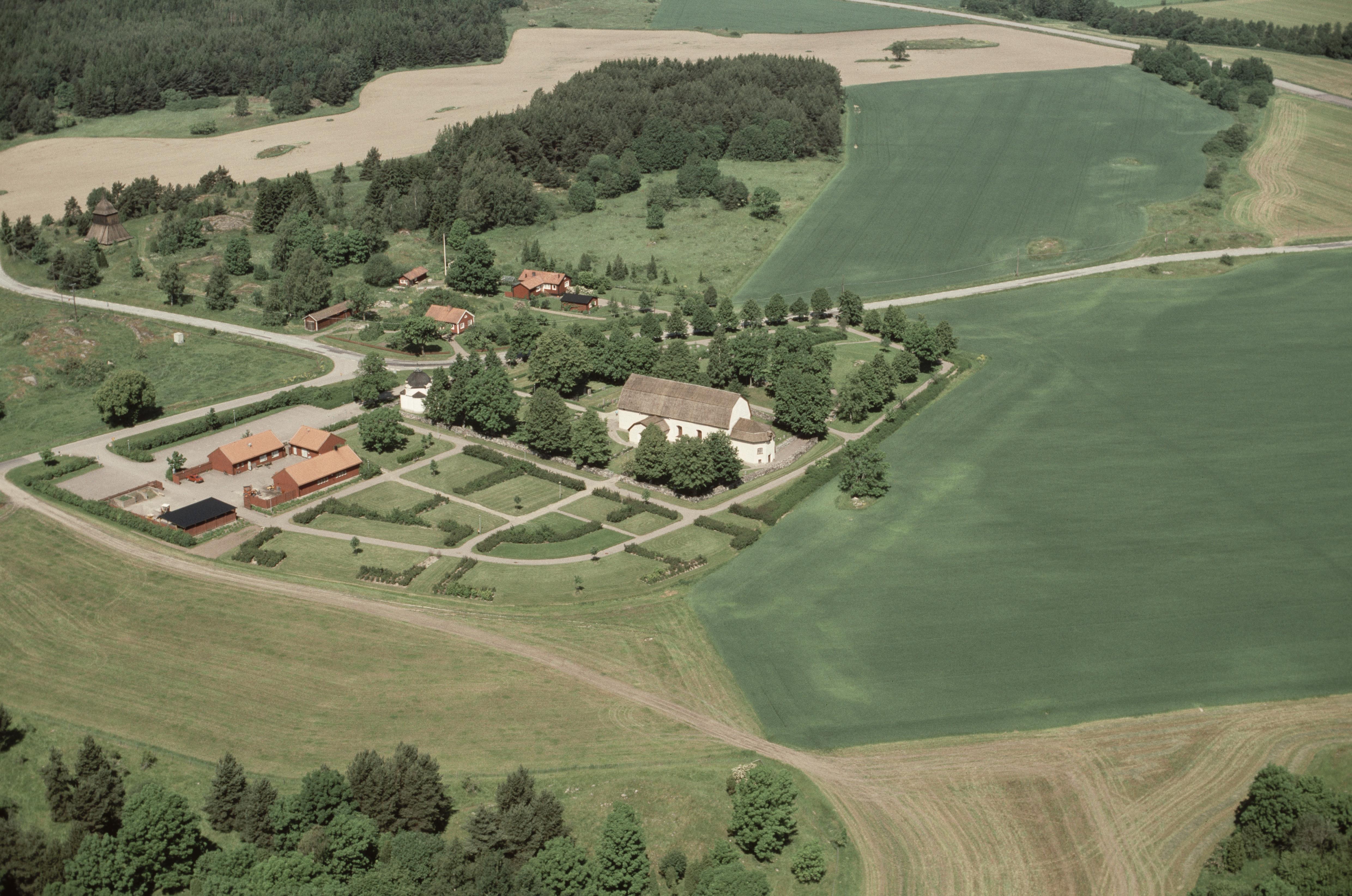 Bro kyrka vid fornlämningsområdet Husby i Bro. I bildens nedre del Husby gravfält RAÄnr Bro 83:1 med Assurs hög RAÄnr Bro 82:1-2, boplats RAÄnr Bro 297 m.m. Bilden är tagen mot (väderstreck): NV
