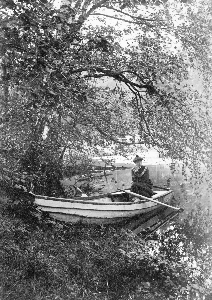 Lerums socken. Aspenäs herrgård, båt vid dammen bakom förvaltarbostaden, Hermine Henriques