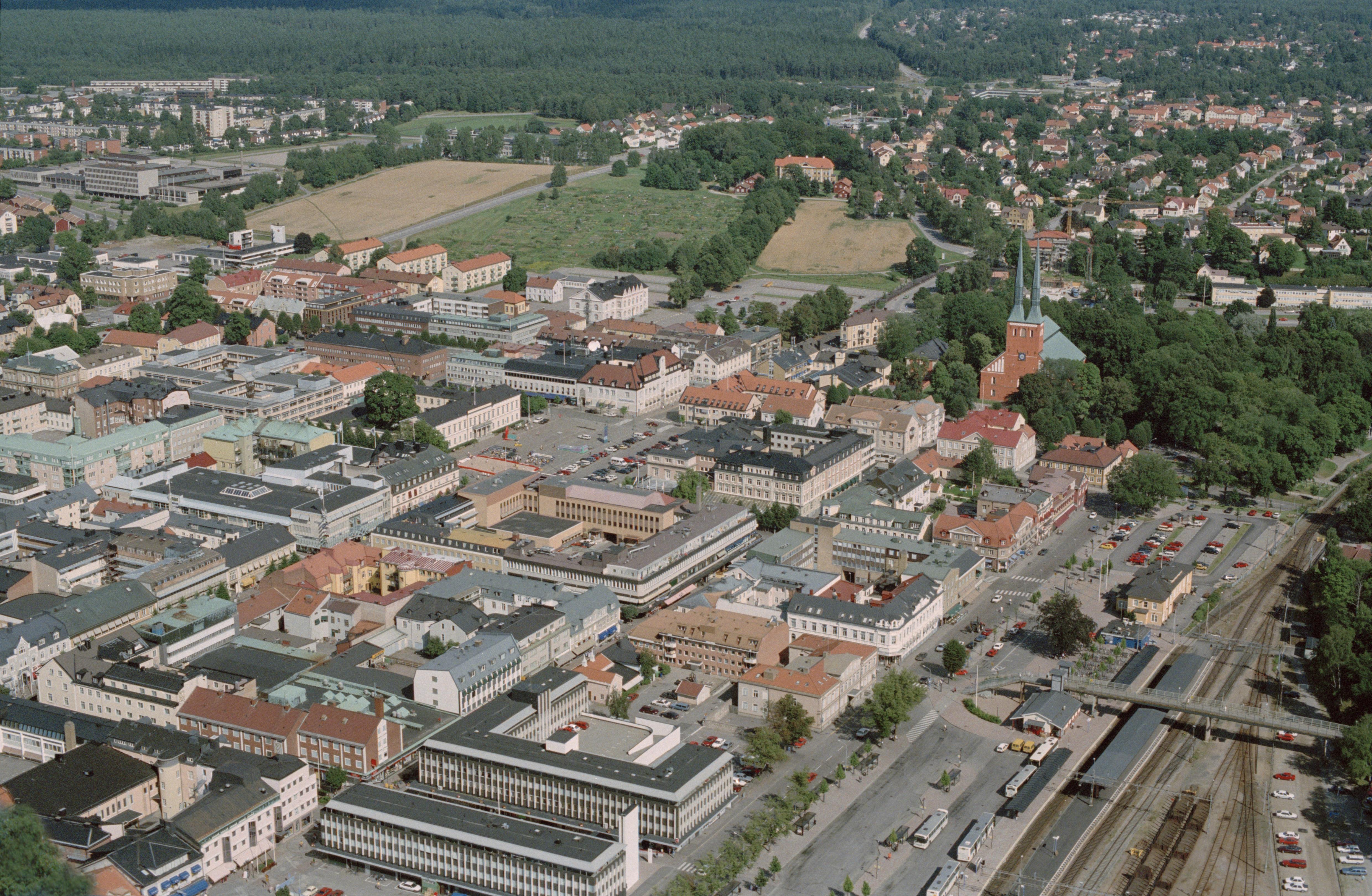 Växjö stad. Växjö domkyrka till höger om bildens mitt. Bilden är tagen mot (väderstreck): ONO