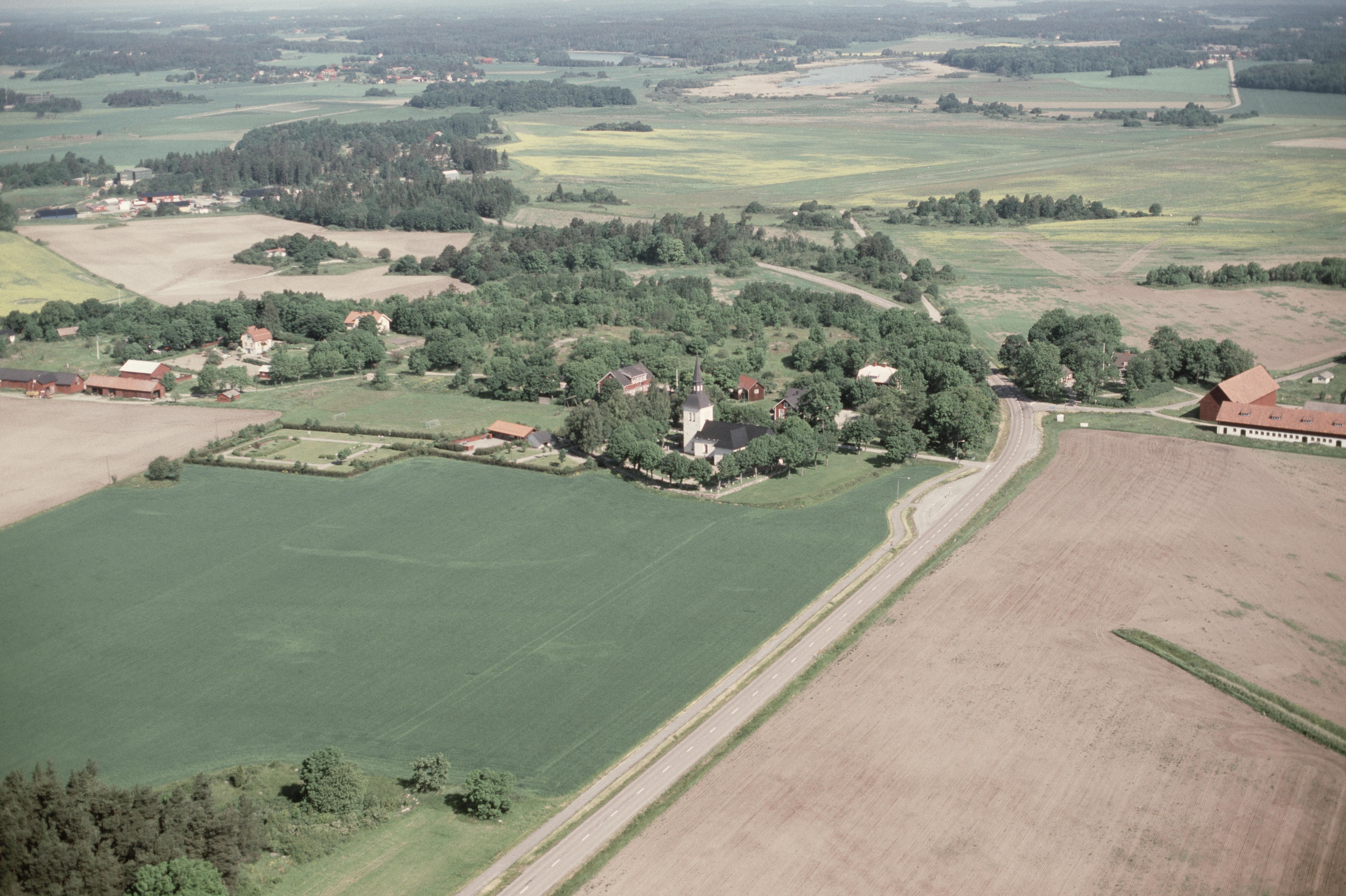 Skå kyrka och kyrkby vid bildens mitt. Till vänster om bildens mitt hög RAÄnr Skå 44:1. Bilden är tagen mot (väderstreck): NV