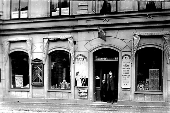 Fasad av byggnad; skylt med text "A:B WILH. BÄCKMAN FÄRGHANDEL". I förgrunden står en man och ett barn.