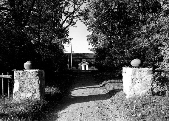 Kraftiga grindstolpar i sten med Kila prästgård i bakgrunden.