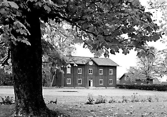 Större träbyggnad i två våningar med urliknande föremål på väggan..