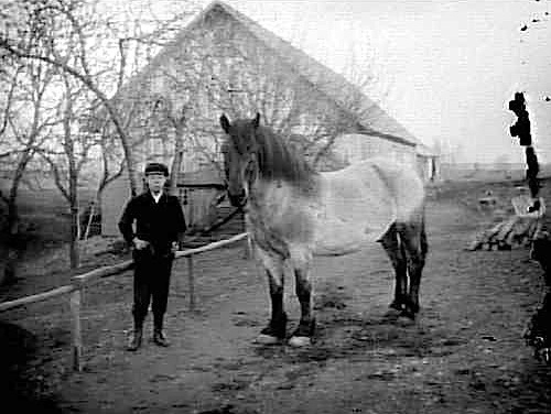 EN POJKE STÅR MED EN GAMMAL HÄST FRAMFÖR STALLET
