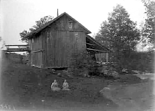 TVÅ KVINNOR I GRÄSET FRAMFÖR EN VATTENKVARN.