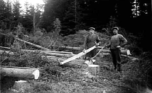 TVÅ MÄN HUGGER TIMMER I SKOGEN.