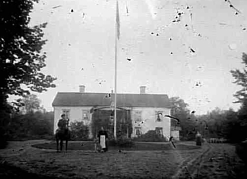 På gårdsplanen framför bostadshuset sitter en man på en häst.