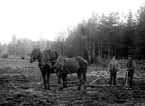 HARVNING MED PARHÄSTAR, SANNOLIKT ANVÄNDER MAN EN GÅSFOTAHARV. EN MAN GRÄVER MED EN SPADE.