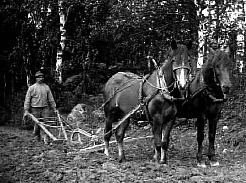 EN MAN PLÖJER MED HJÄLP AV TVÅ HÄSTAR.