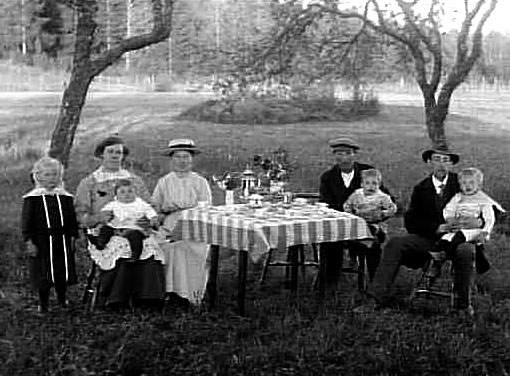 MÄN, KVINNOR OCH BARN DRICKER KAFFE I TRÄDGÅRDEN.