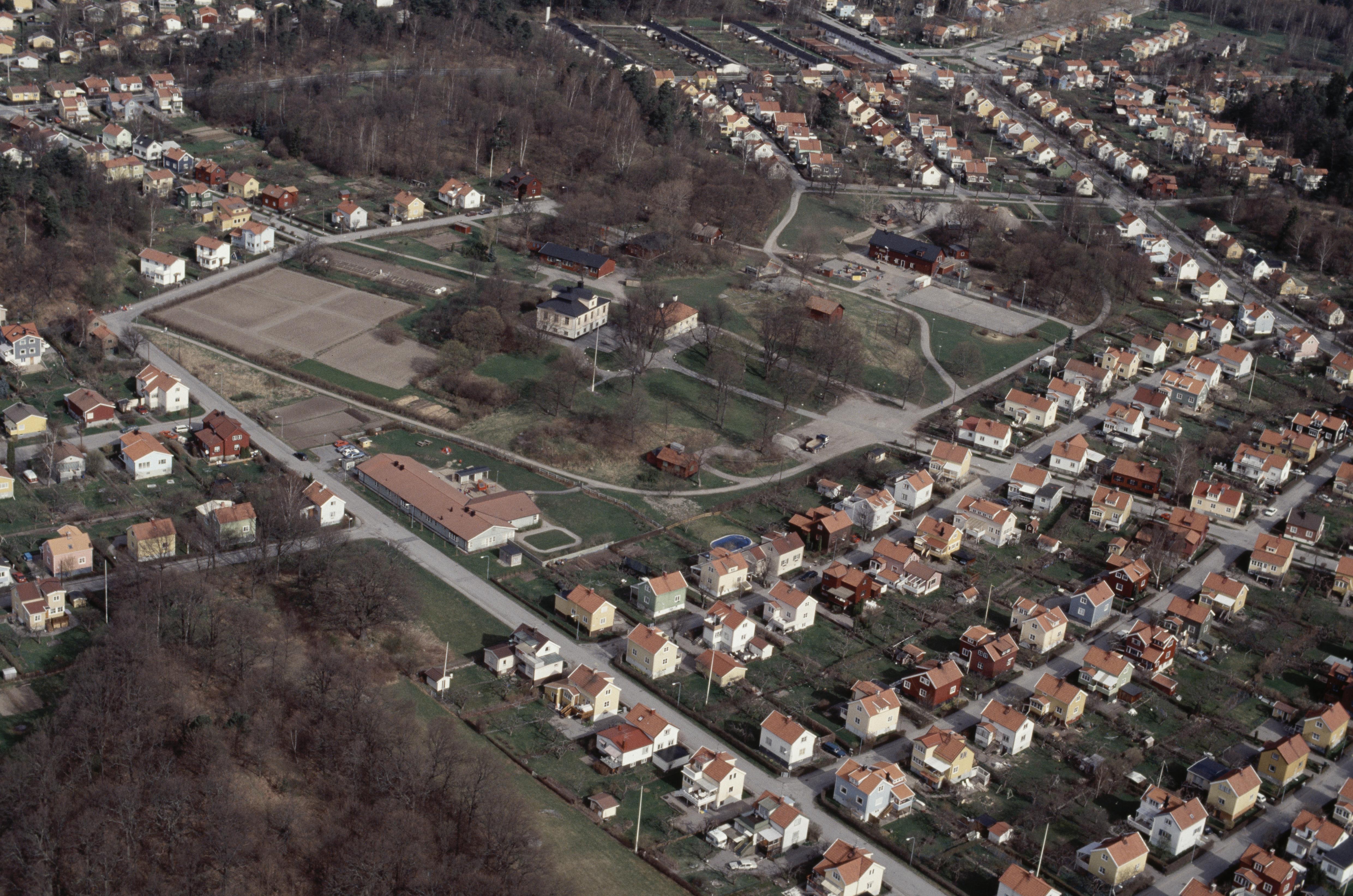 Stadsdelen Bromma i Stockholms Västerort. I bildens övre del gravfält RAÄnr Bromma 62:1 m.m. och Stora Ängby herrgård i området Norra Ängby. Bilden är tagen mot (väderstreck): NNV