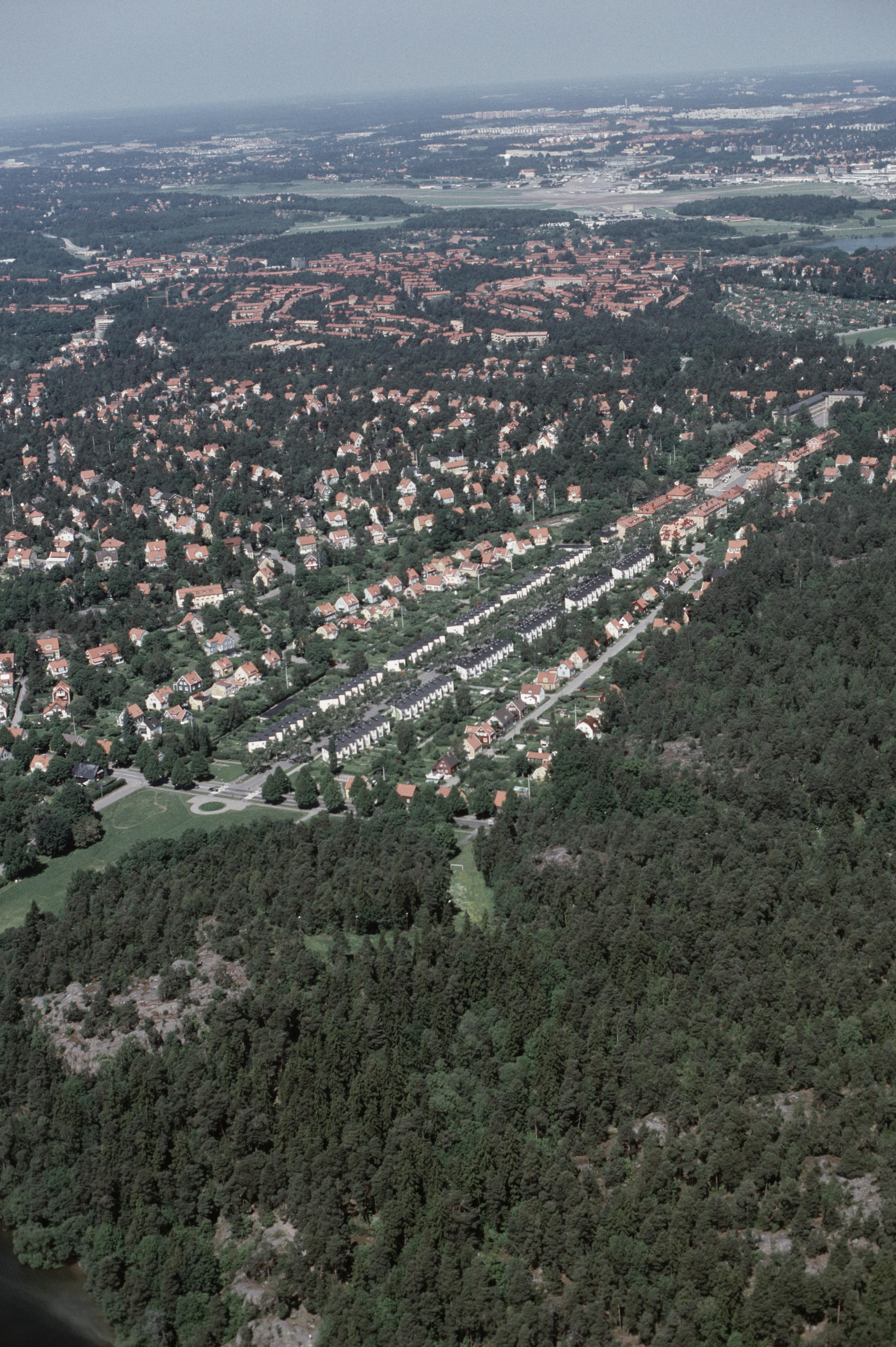 Beskrivning: Områdena Ålsten och Smedslätten i stadsdelen Bromma i Stockholms Västerort. Ålstensgatan längs bildens mitt. I bildens övre del Bromma flygplats. Bilden är tagen mot (väderstreck): NNV