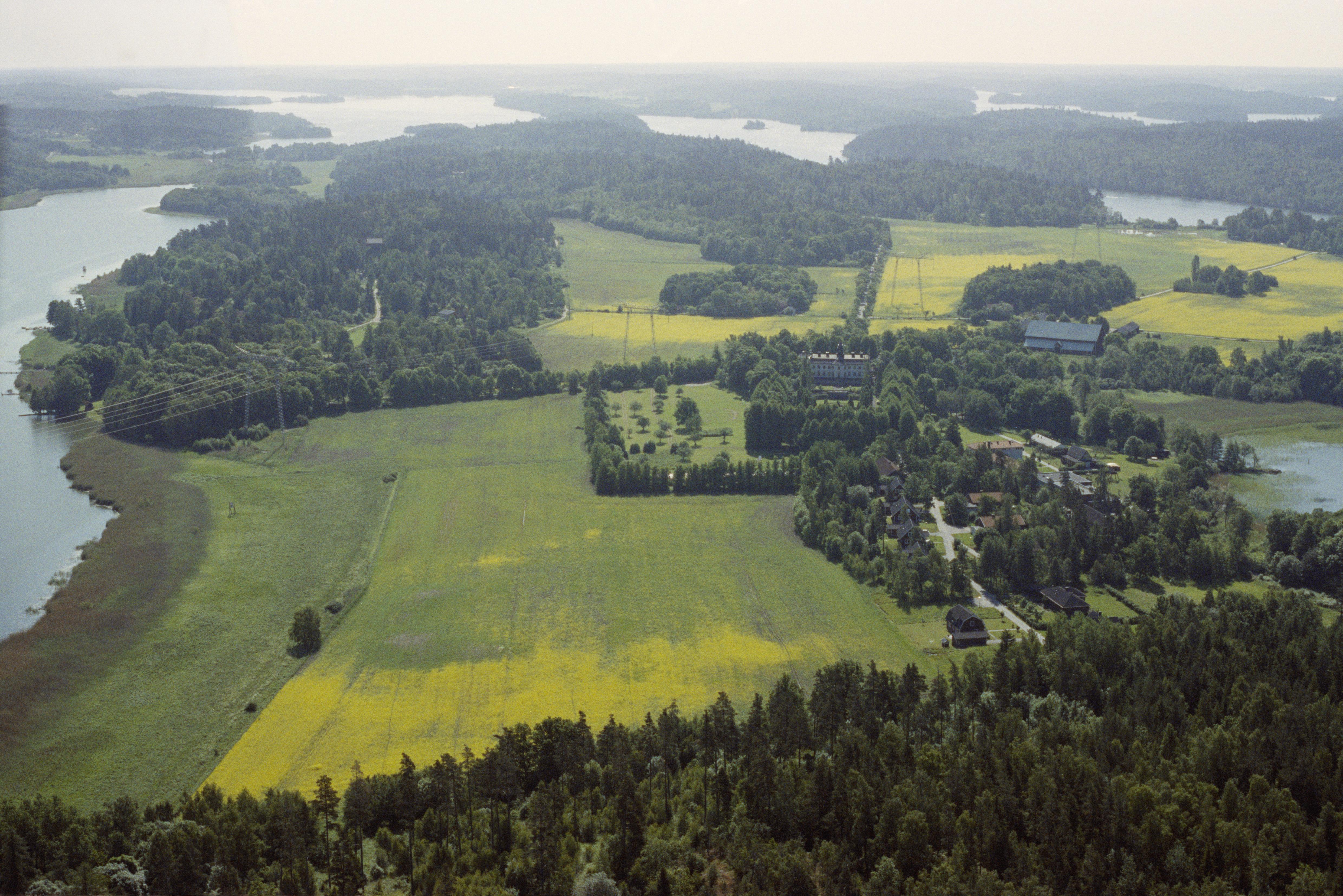 Helgö mellan Bokholmssundet och Norrsundet i Mälaren. Vid bildens mitt Kaggeholms herrgård RAÄnr Ekerö 46:1. I bildens övre del Kyrkfjärden. Bilden är tagen mot (väderstreck): SO