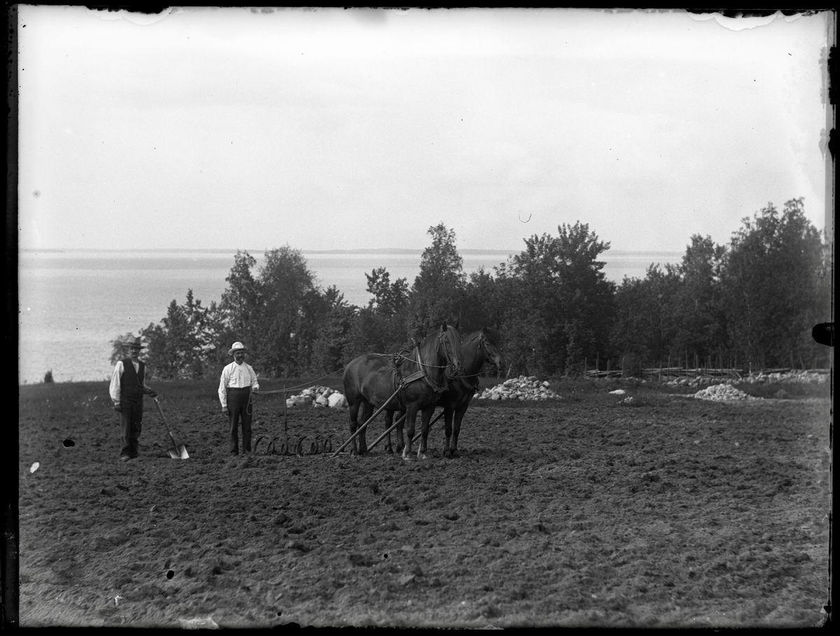 Oliver och Johan Ludvig Olsson harvar med parhästar