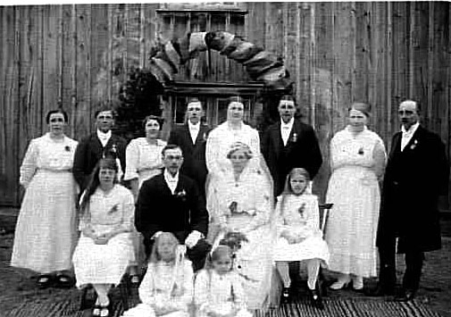 BRÖLLOPSPARET MAJA I FÄGRE OCH ARVID JOHANSSON OMGIVNA AV BRÖLLOPSGÄSTER