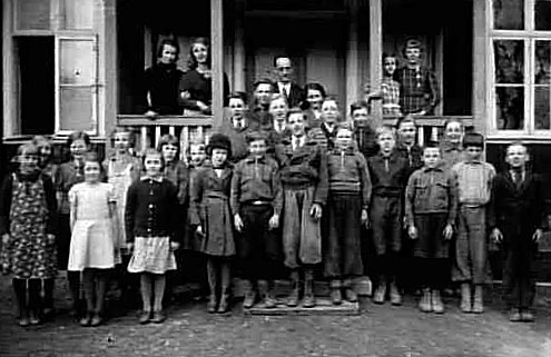 En skolklass med sin lärare Tivesjö, framför skolhuset i Fagerlid.
