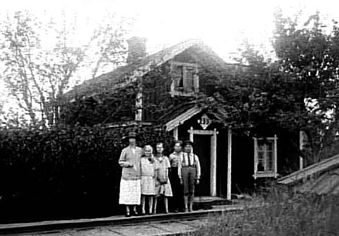 EN KVINNA OCH FYRA BARN STÅR FRAMFÖR BANVAKTSTUGA NR 235 INTILL JÄRNVÄGEN VID BJÖRKULLA I ÄLGARÅS.