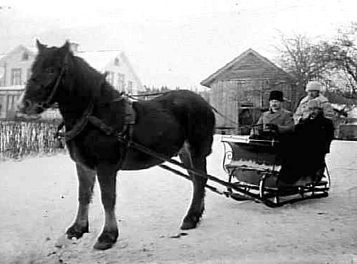 Titel: TRE MÄN I EN SLÄDE DRAGEN AV EN HÄST. KUSK K W JOHANSSON, ÄSPÄNG, FREDSBERG.