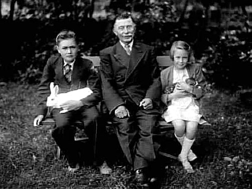 ERIK RUD MED SINA BARN, LENNART OCH VIVIAN, SOM HÅLLER EN KANIN OCH EN KATT.