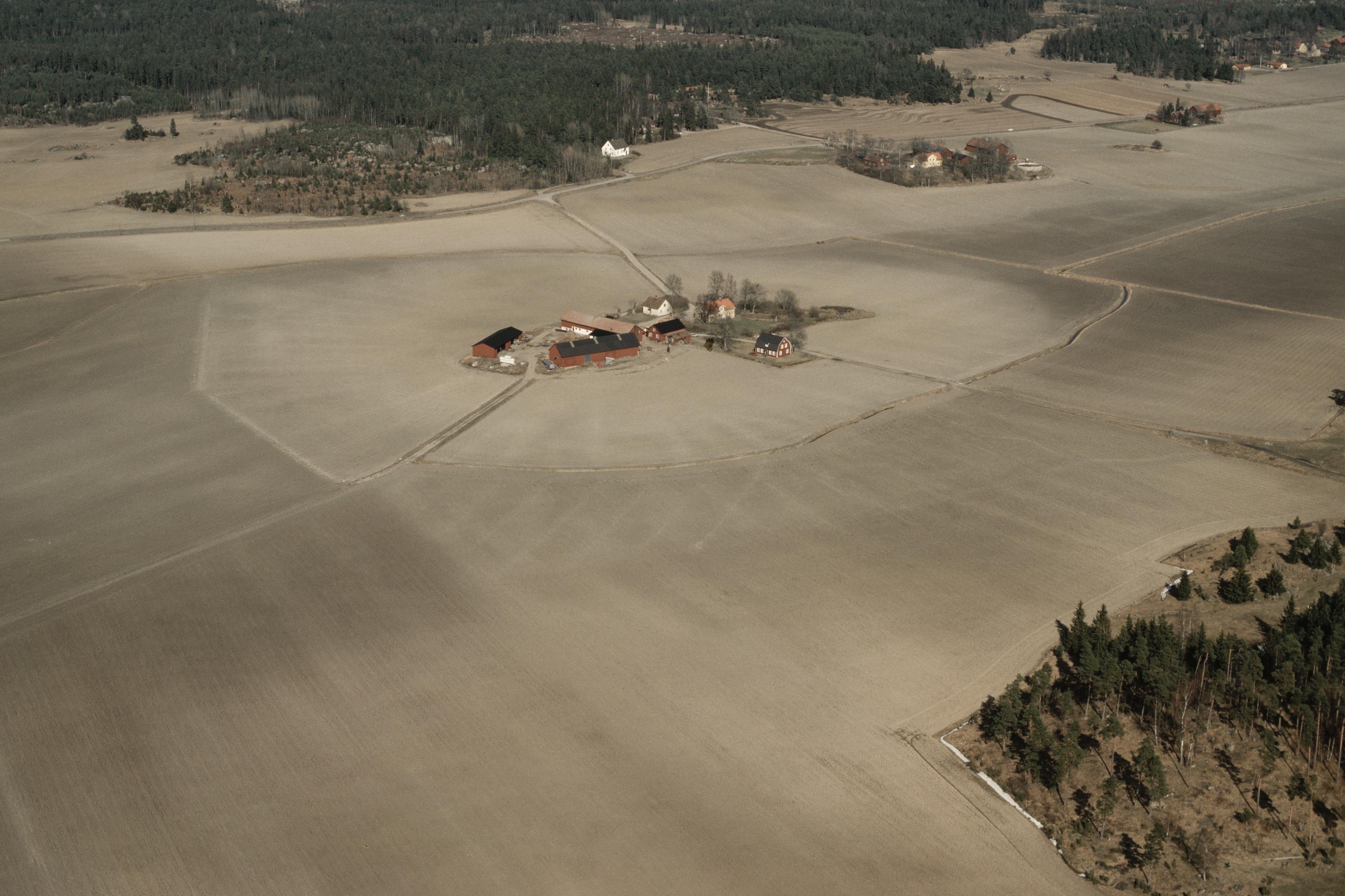 Näs-Edeby gård vid bildens mitt. Nere till höger område med stensättningar, bl.a. RAÄnr Uppsala-Näs 90:1. Bilden är tagen mot (väderstreck): ONO